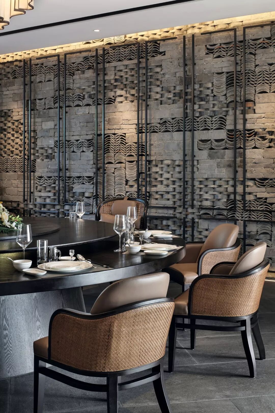度假风格的藤椅餐桌等配饰与当地传统的青砖墙面结合,于木色与质朴中融入现代的触感。莲花灯饰层层铺叠而下,阐释空间特征的同时,也体现了设计师对于九华山在地文化历史与当代空间设计相互交融的设计思考。