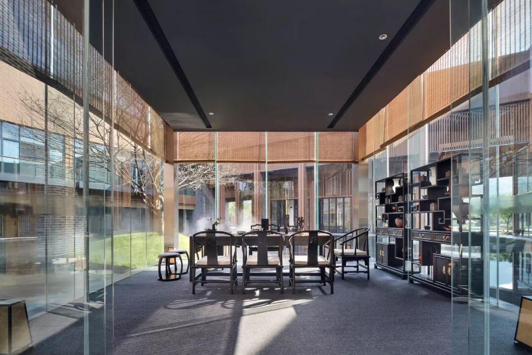 茶室以廊道联通,延伸入内庭的莲池,保持通透性的设计,四面落地玻璃墙面可以看到天空在水面的倒影。古朴的桌椅、书架置于其间,九华茶文化的厚重感喷薄而出。