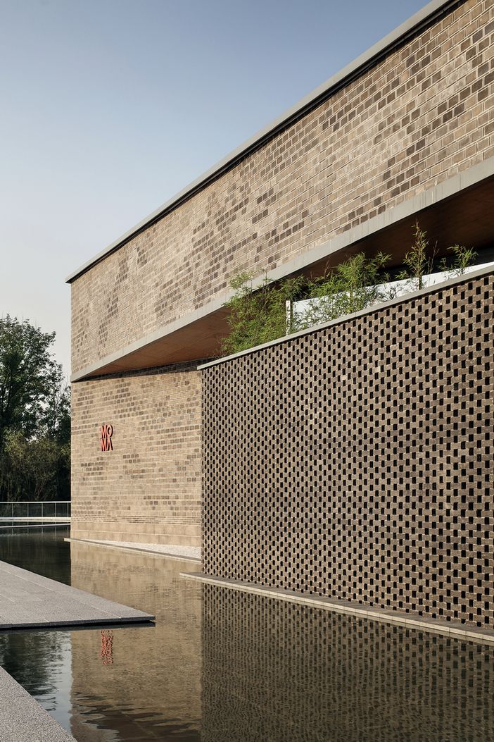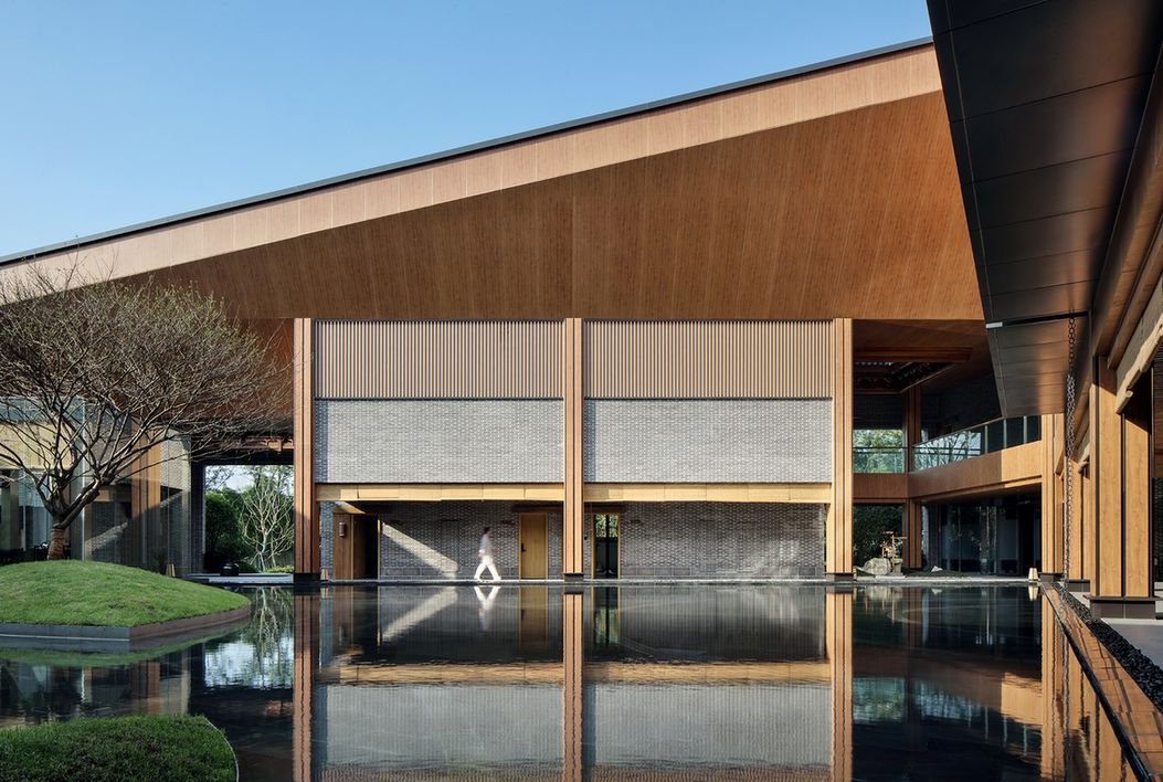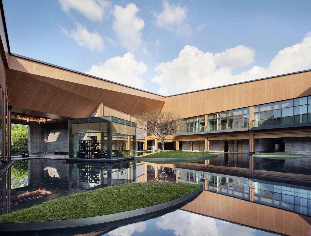 禅院集修心、会友、学习等多种功能于一体,各类活动围绕着内部的庭院展开。庭中镜水莲池波光浮动,碧草如丘缀于其间,砖瓦木石与钢结构构筑的现代东方建筑剪影倒映于莲池,呈现一派清幽雅静的山水意境。