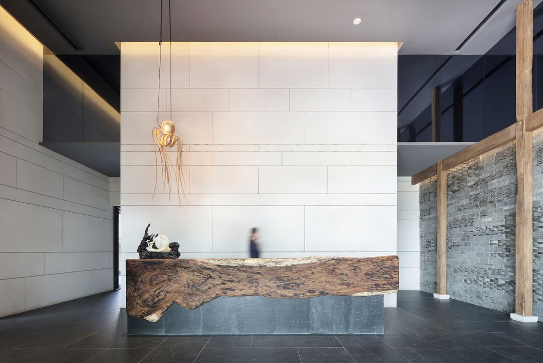 日月交替虽是再寻常不过之事,亦是天地运转的规律,代表着得失、取舍、爱憎的日月禅作品被置放于古旧榆木打造的接待台上,嵌于白色的背景墙和黑色的地砖之间,让人甫一进入,可保持一颗平常心,感受空间的空灵、朴素与祥和。外墙一侧由徽州特色的青砖黛瓦拼合,再以东方传统的木色为梁,枯木藤椅于一角自然生长,呈现出东方禅境所追求的清逸简雅与返璞归真。