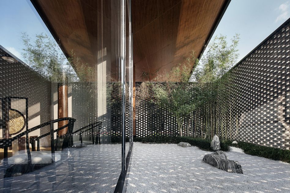 接待空间、禅堂小院、洽谈区、茶室、中国圈等空间围绕内部的庭院莲池布局,由连廊、过道、楼梯等连接贯通,围合一方空明山水。居于院内,行走其中,人们于曲院回廊里坐享闲暇,以眼、耳、鼻、舌、身感知着空间,对这处天地又有了不一样的理解。