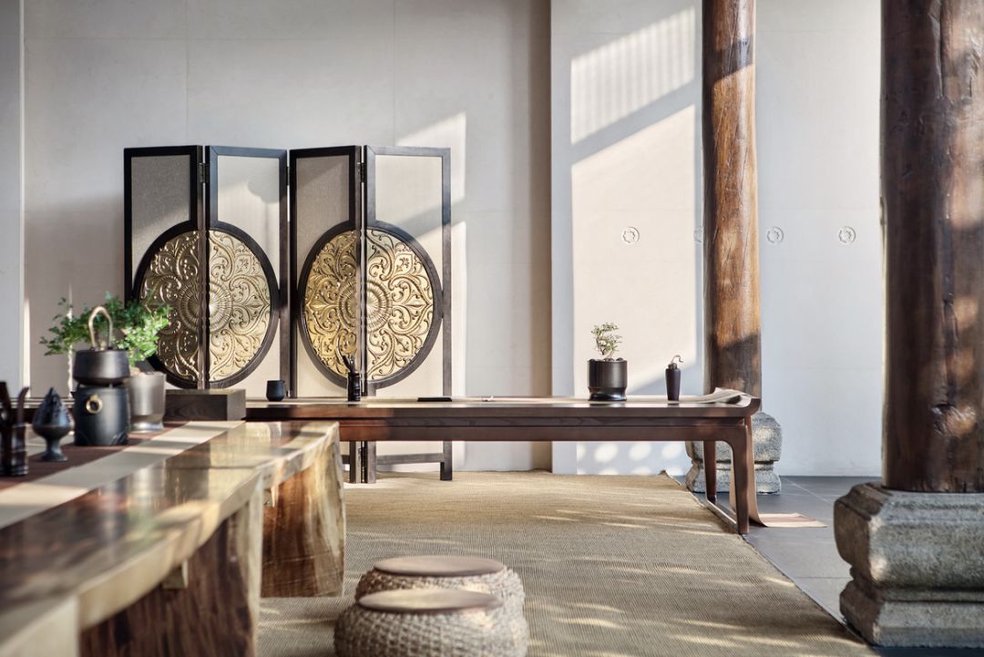作为公共区域,小院常开设佛经讲坛,为世人解惑;或开设茶道、香道、花艺等,促进人文交流。髙敞阔达的古意空间,搭配雅致的屏风、蒲团、长桌、木椅,融合室内幽幽檀香,整个空间的味道与千年九华的历史感与文化感相生相合。