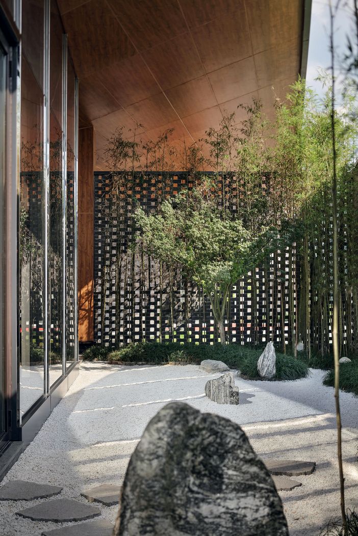 在院落打造上,透明的落地玻璃被用作室内与室外院子的隔断,院中青竹与白色砾石点缀的风景明晰可见,静坐,听经,品茶,心境通畅平和。