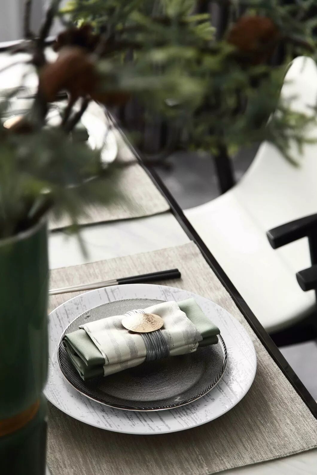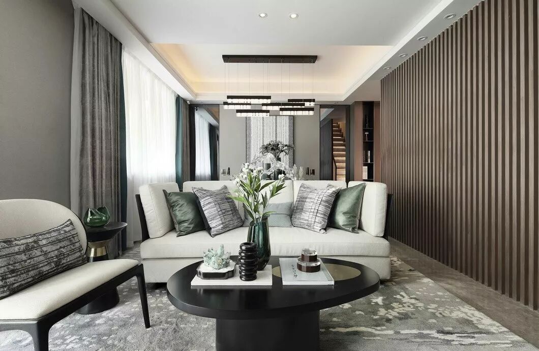 采用绿色、灰色、米色、金色的色彩搭配组合,用现代时尚的色彩关系演绎东方气质的空间,整体更具高级质感。