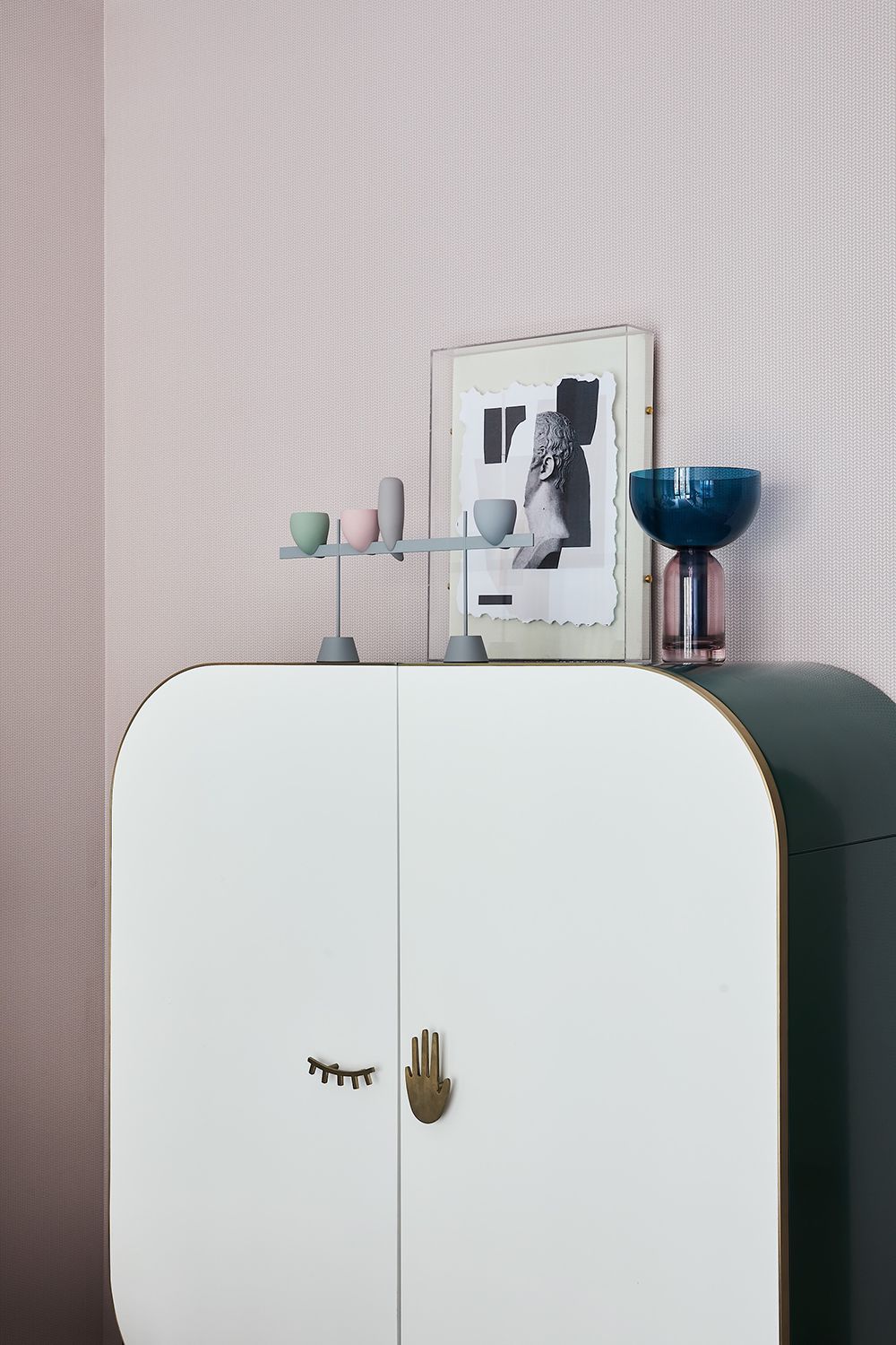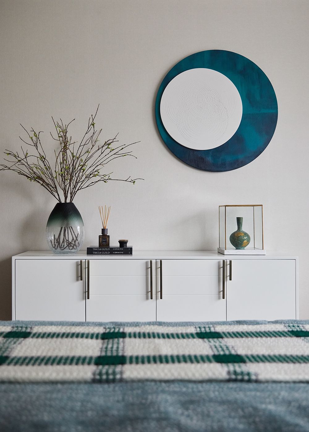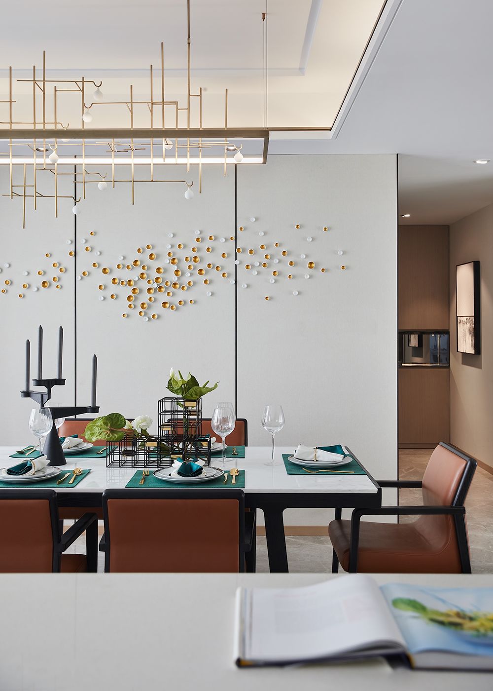 厨房吧台以茶为主题,借由装饰品成为大面积纯白场景内精妙的点缀。