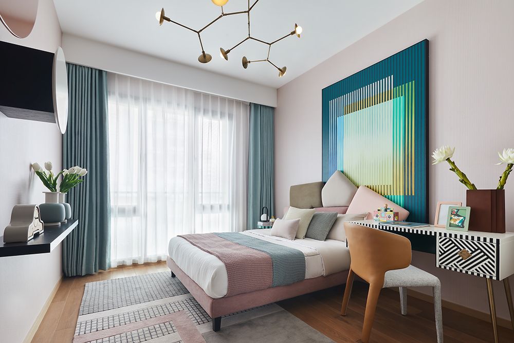 女孩房追求粉嫩、欢快、活泼的氛围,大尺寸装饰画将床、书桌连为一体,强化高低错落之感,化散为整,装饰画与书桌条纹又各相呼应。不规则枝丫型吊灯装点天花,瞬间多了一丝俏皮与灵气。
