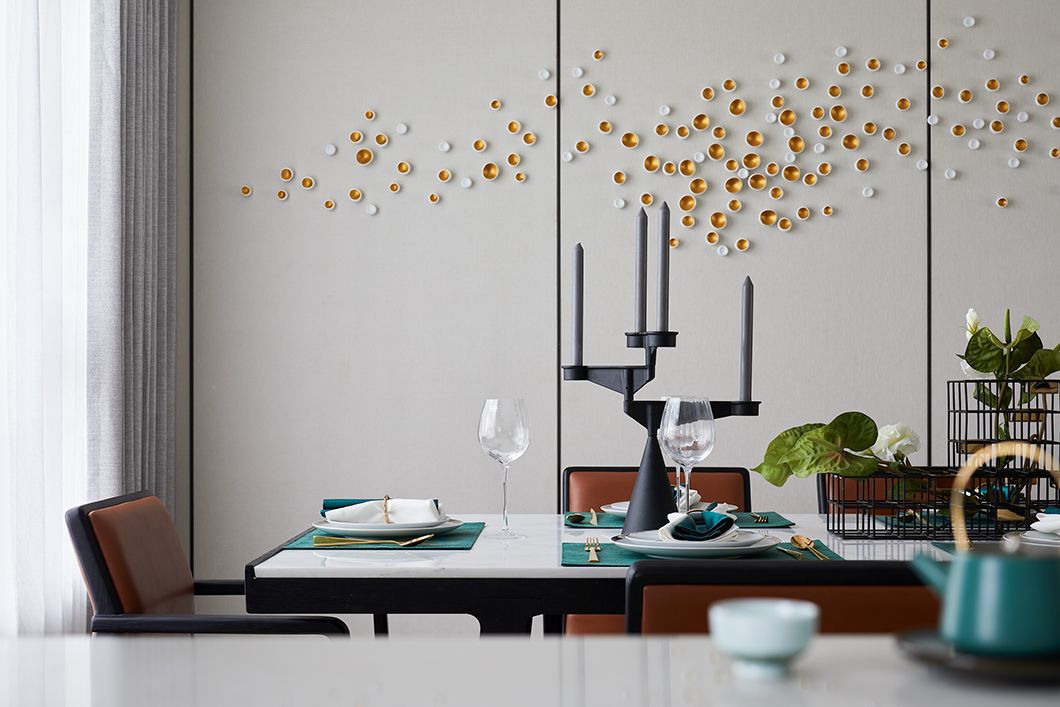 餐厅与客厅、厨房呈开放之姿贯连,将空间尺度拉升到极致。餐厅内欢快的撞色更易调动味蕾。