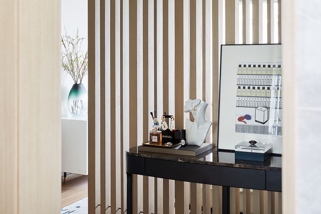 透过木格栅,主卧亦可一窥衣帽间的风采。展示性与功能性兼并的衣帽间设立于走廊尽头,设计师在不经意的笔触中,将低调奢华的高贵感勾勒而出。