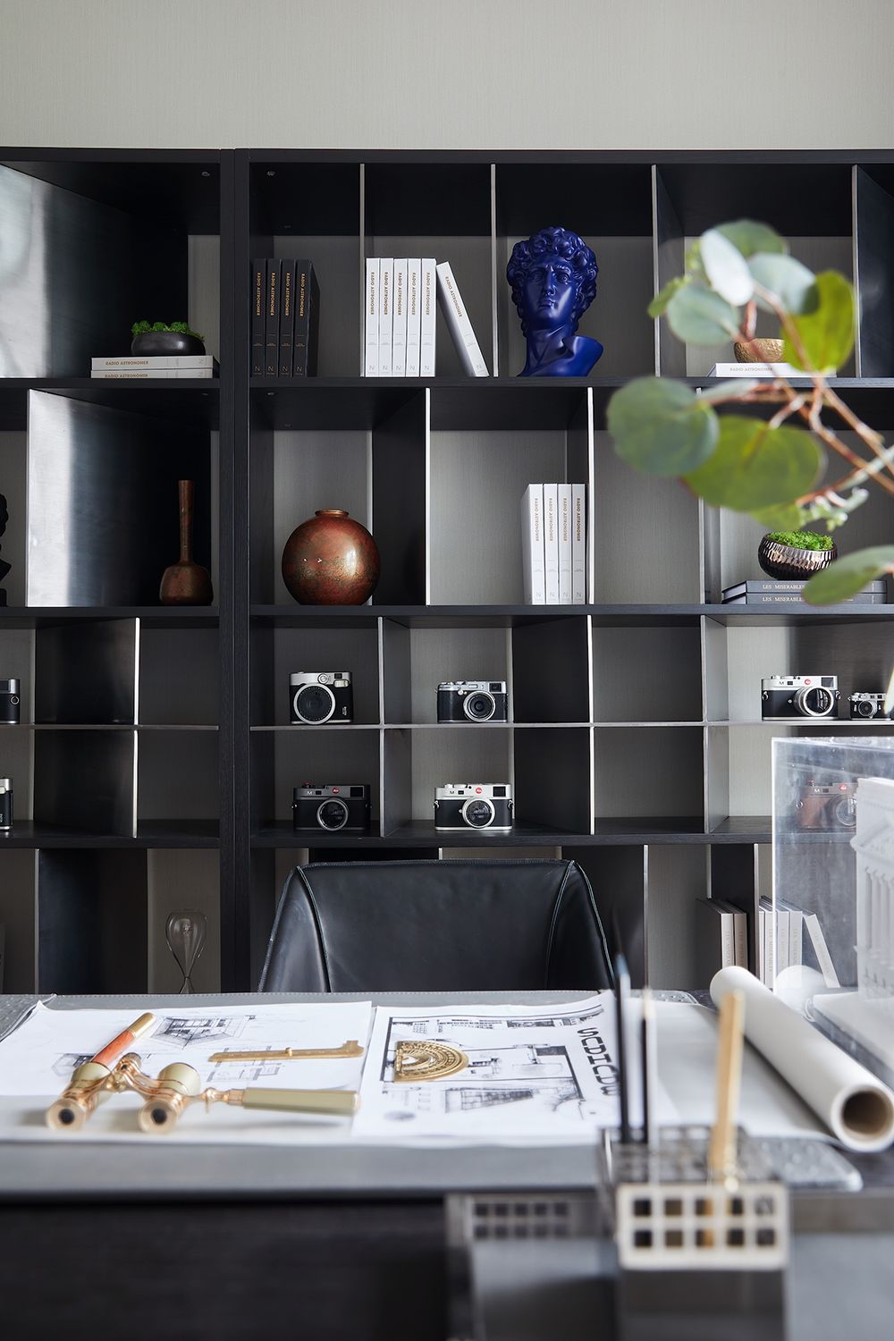书房则以沉稳为主基调,不规则书架设立多样陈列方式,格架大小不一,挡板倾斜角度各异,兼具功能、特色与美观,同时便于物件和藏品的展示和存储。