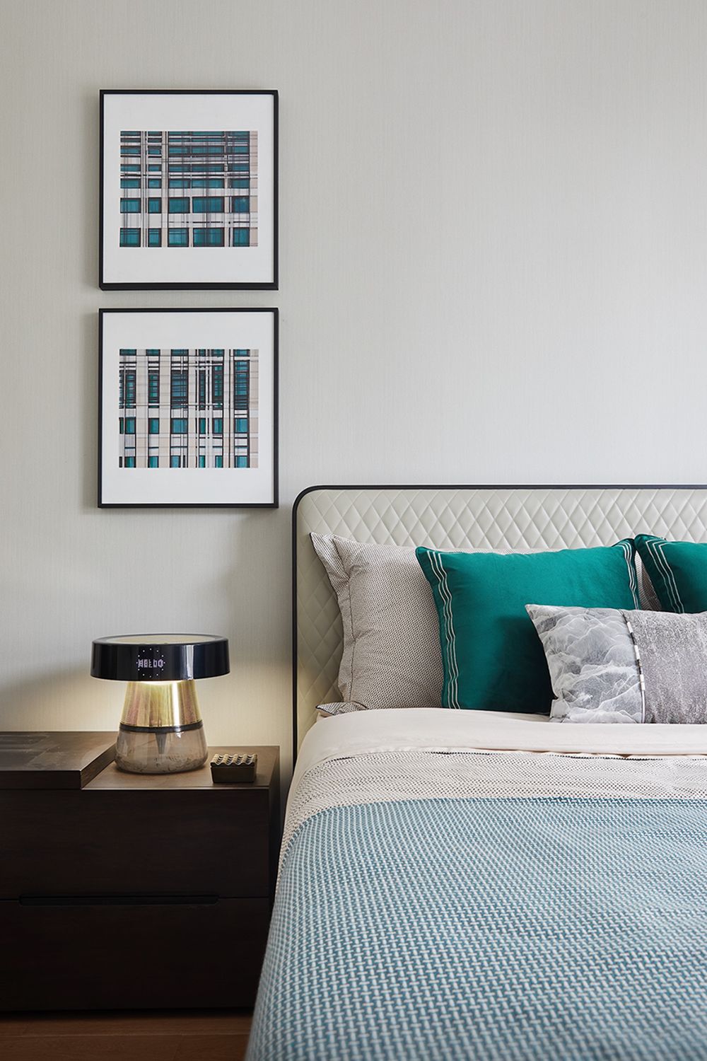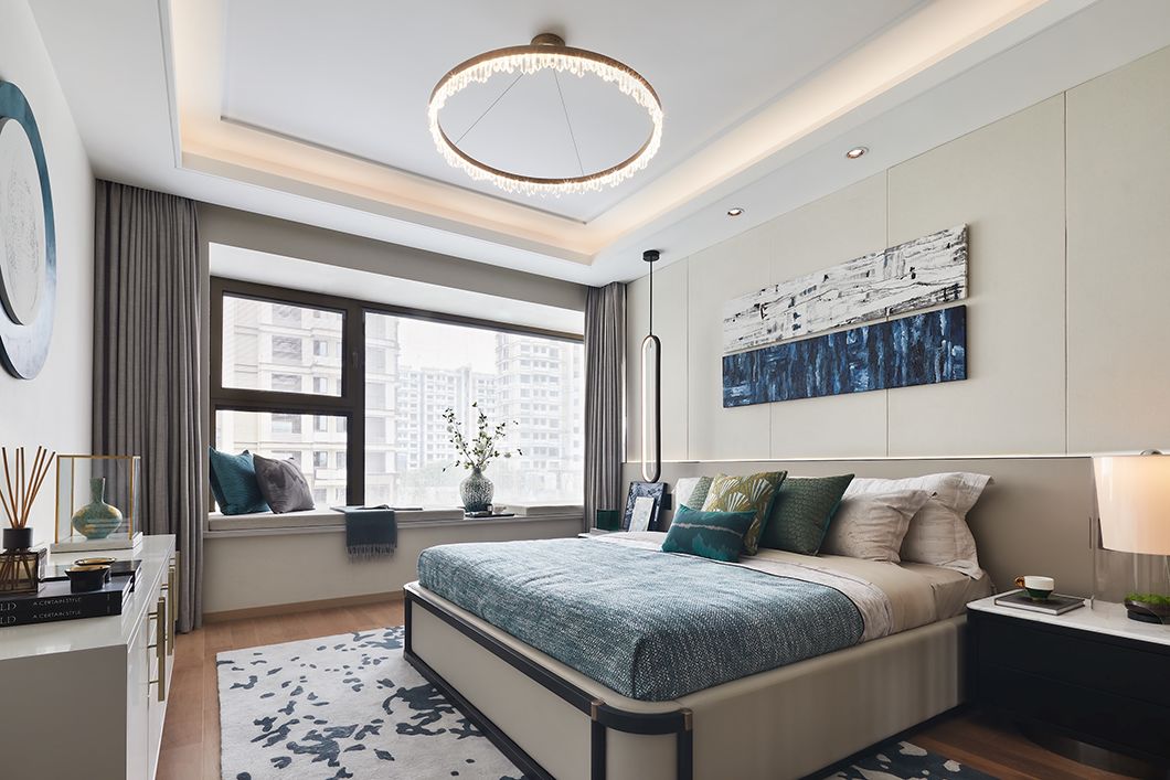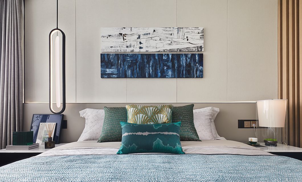 床头灯具以高低错落的组合形式打破常规,提升层次。立体感极强的挂画,为主卧的视觉焦点,家具造型也更为凸显现代气息。