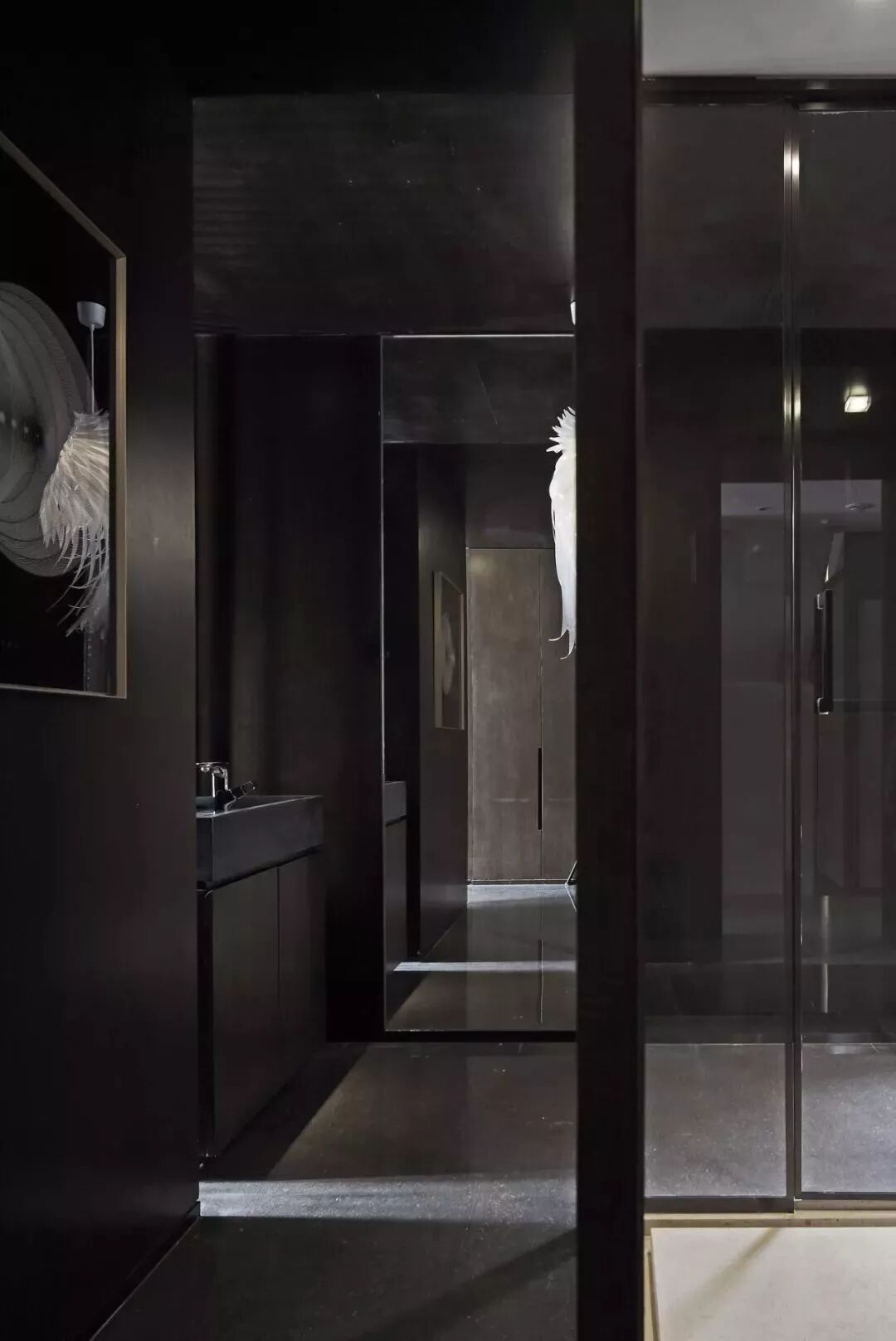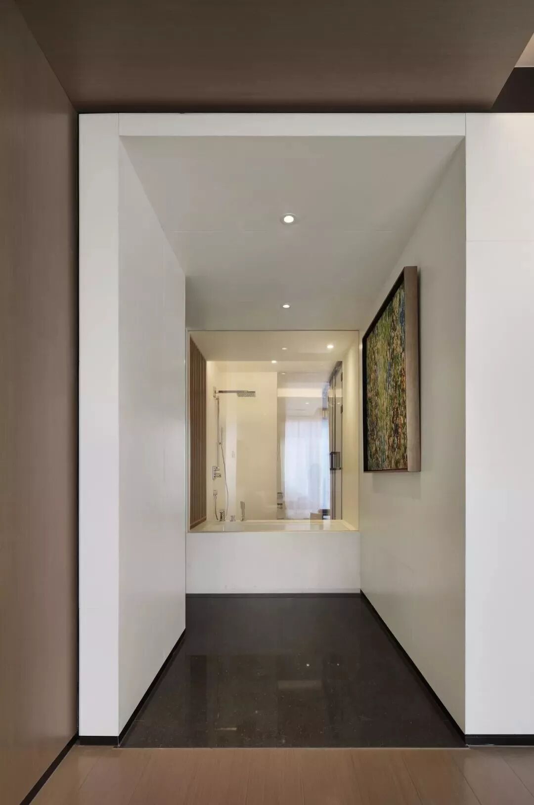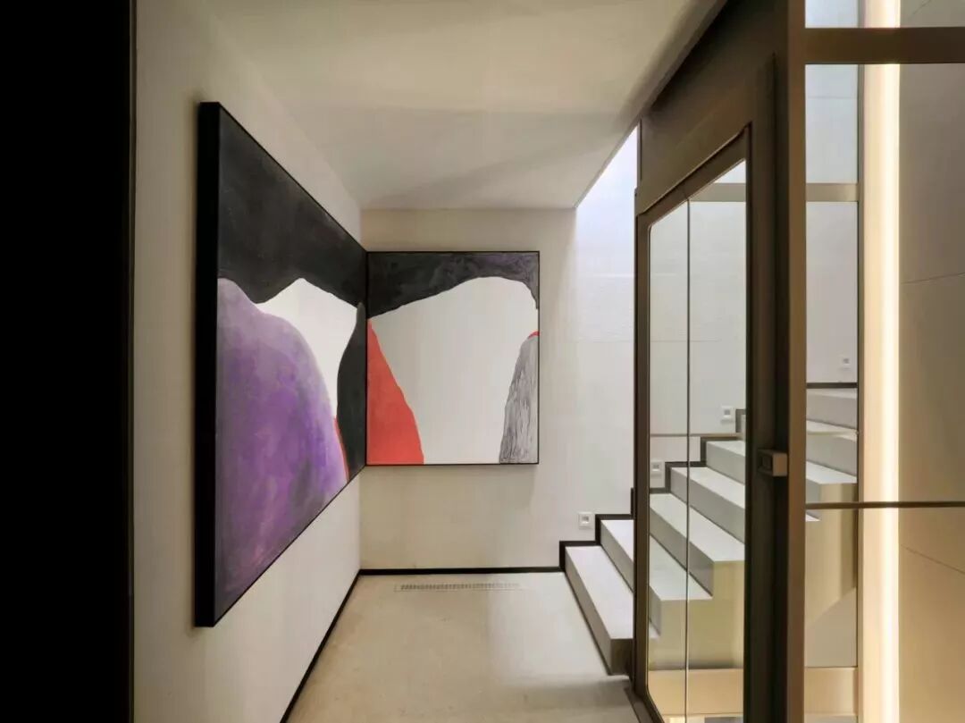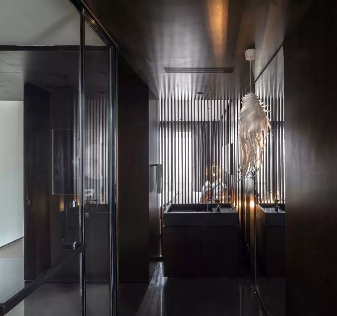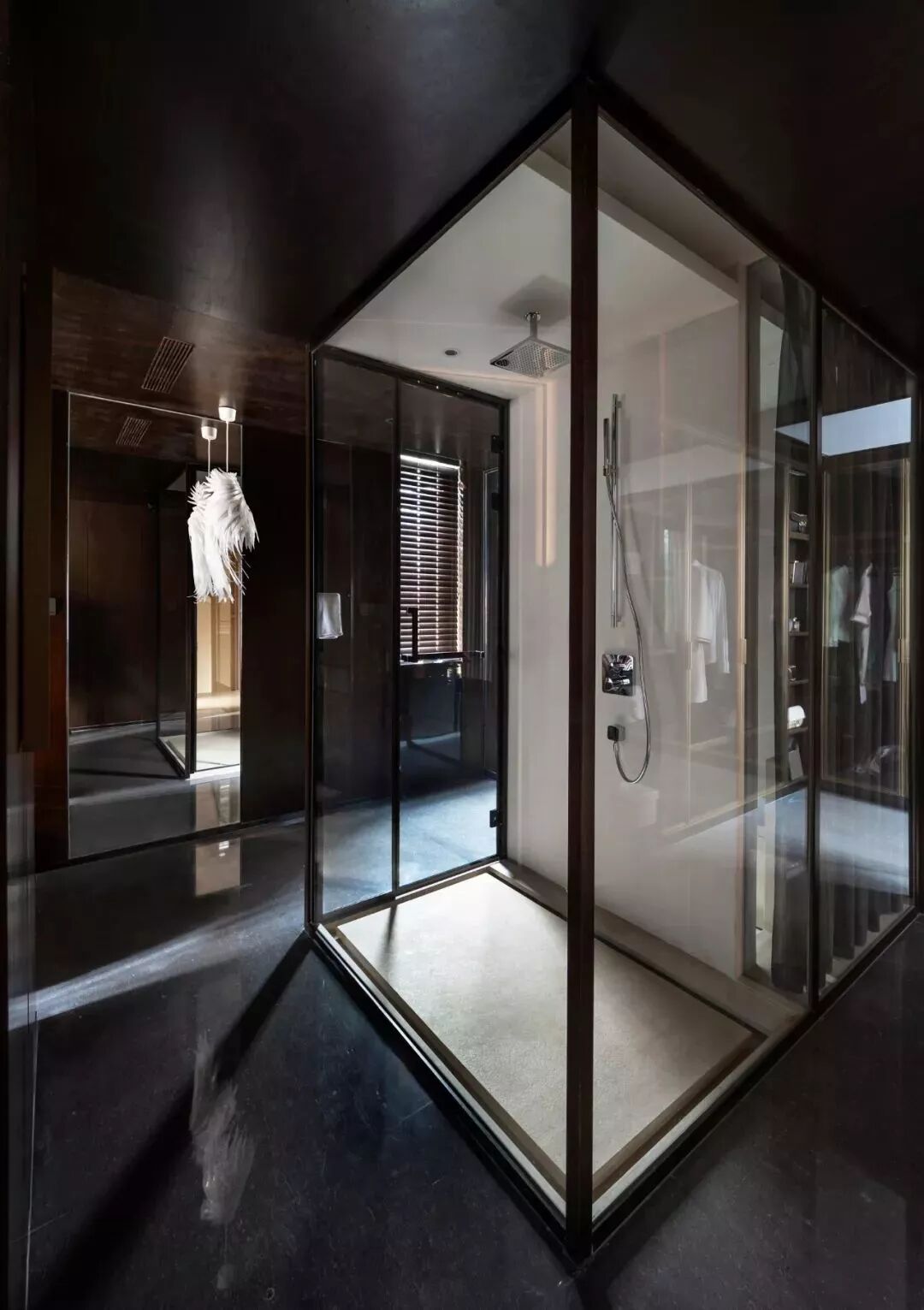 在艺术画作的引领下,拾阶而上,到达二层居住区。主卧系统伺服空间中置,电动雾化玻璃,将私密性和通透性切换自如。空间面纱再一次粉墨登场,不同功能空间之间的功能透析以及非透明状态下的交通问题都由其承担解决。以歙砚制作而成的洗手台盆、隐藏式的下水线路处理、冲淋房阴角弧形处理,以及拼接的考究等处处都呈现出对生活细节的推敲。