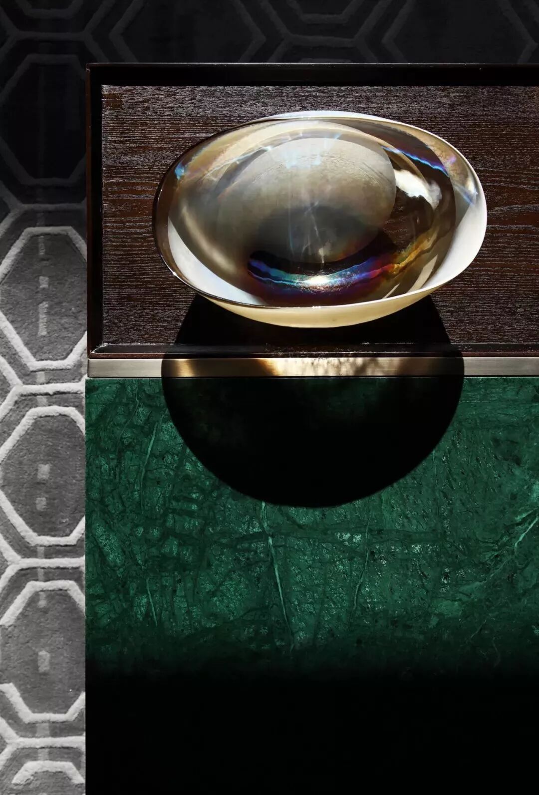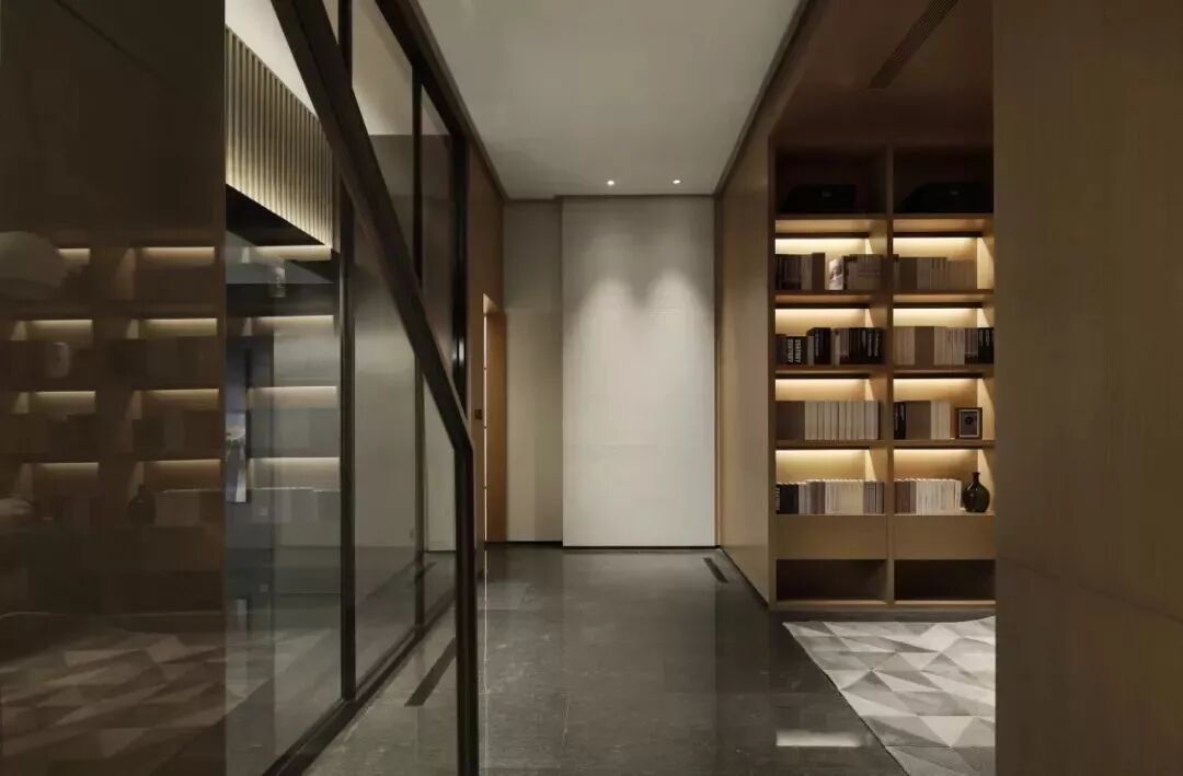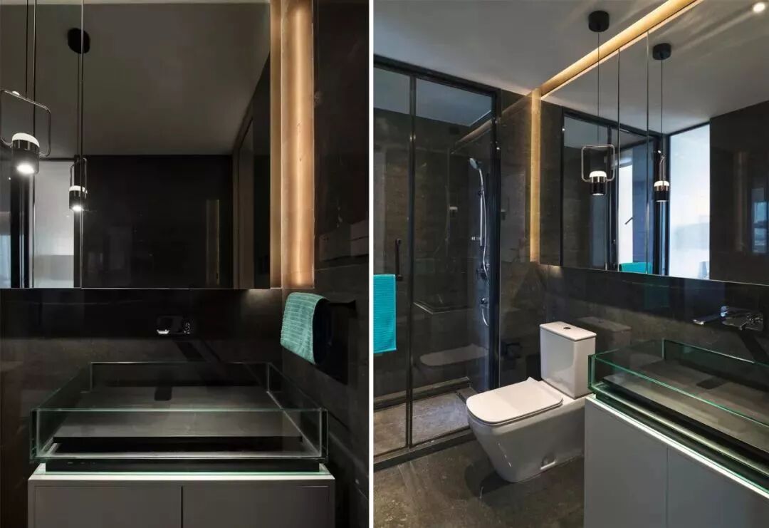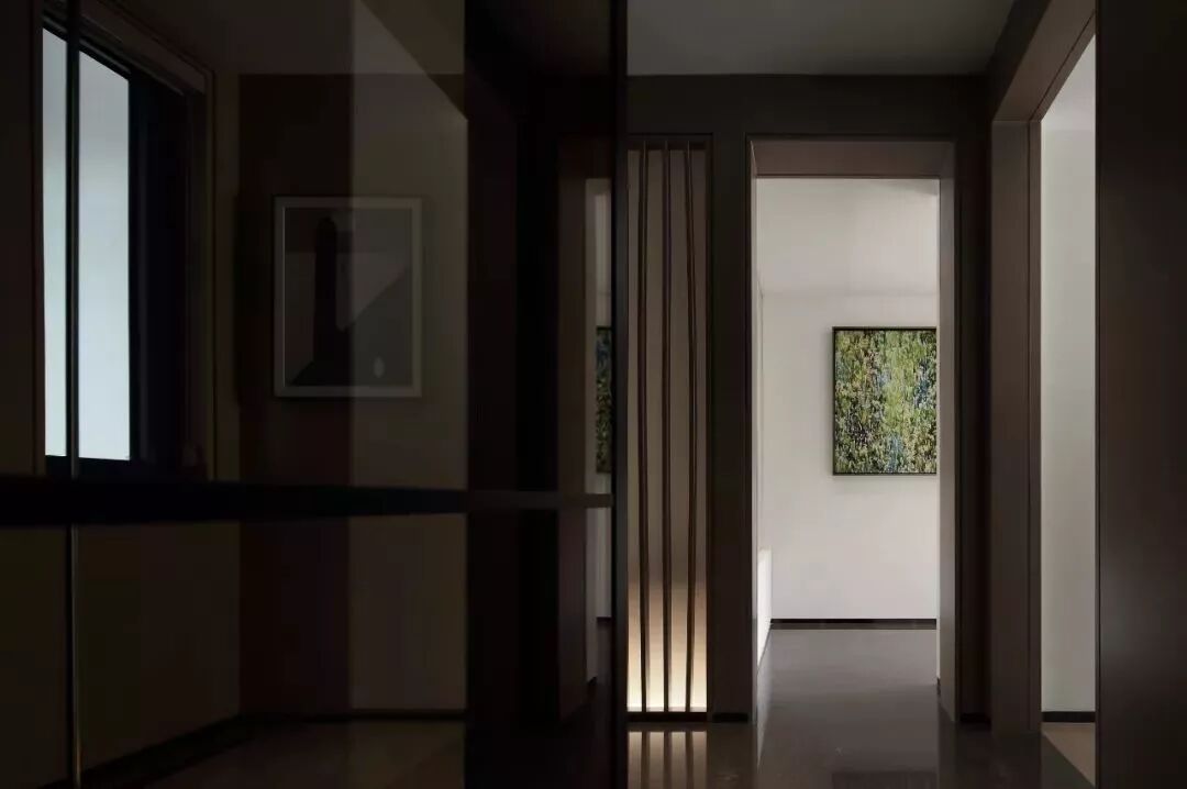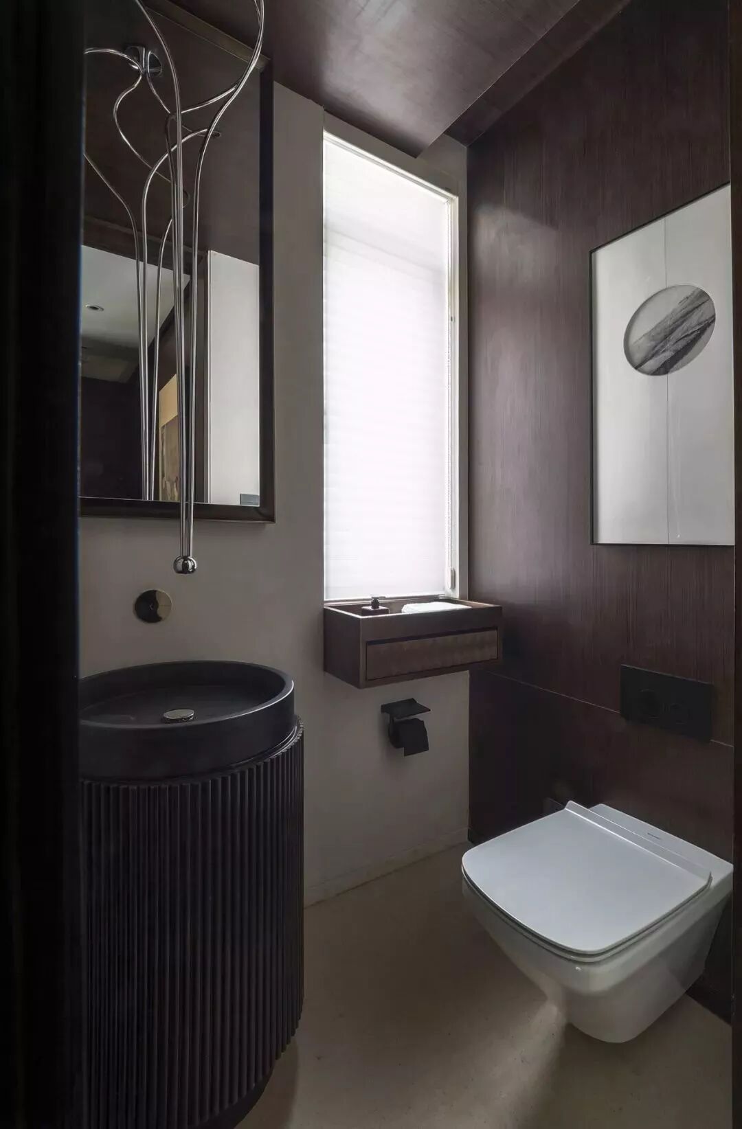 在艺术画作的引领下,拾阶而上,到达二层居住区。主卧系统伺服空间中置,电动雾化玻璃,将私密性和通透性切换自如。空间面纱再一次粉墨登场,不同功能空间之间的功能透析以及非透明状态下的交通问题都由其承担解决。以歙砚制作而成的洗手台盆、隐藏式的下水线路处理、冲淋房阴角弧形处理,以及拼接的考究等处处都呈现出对生活细节的推敲。