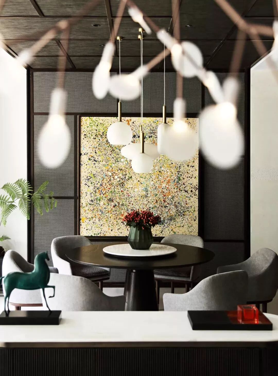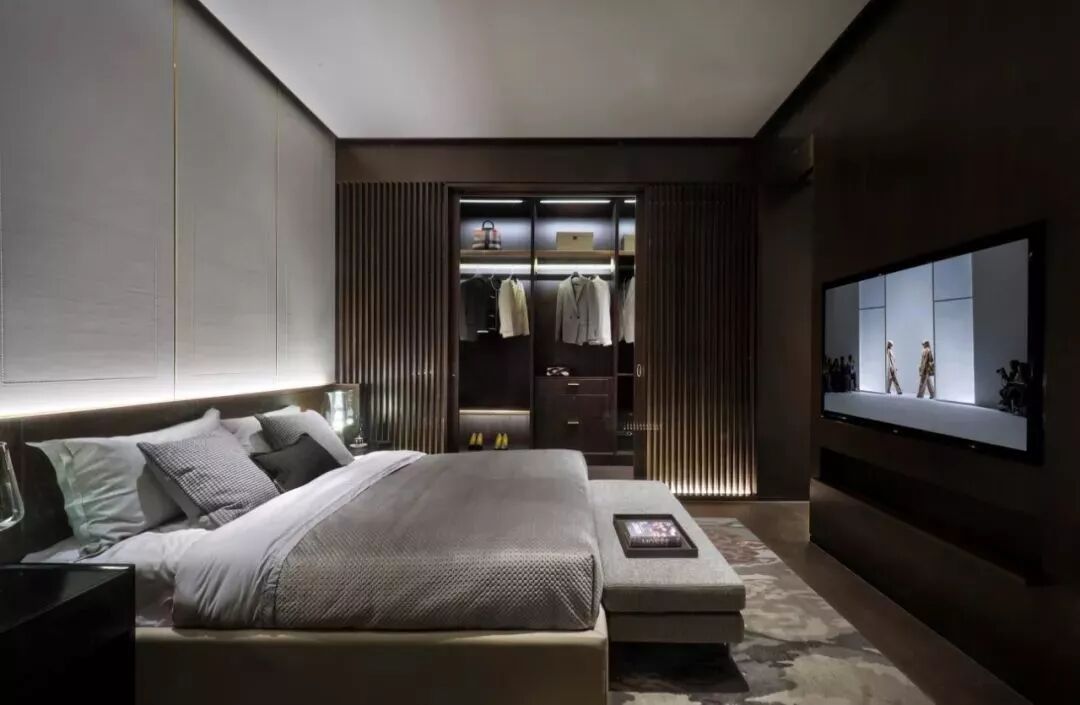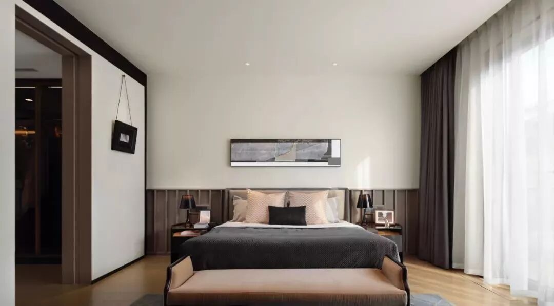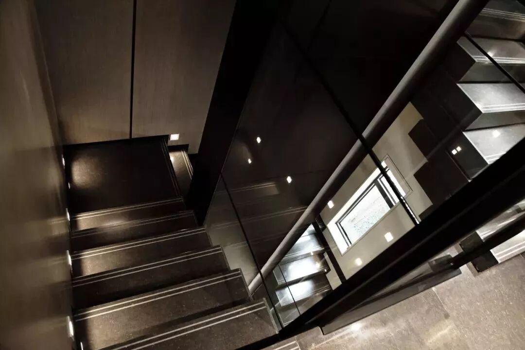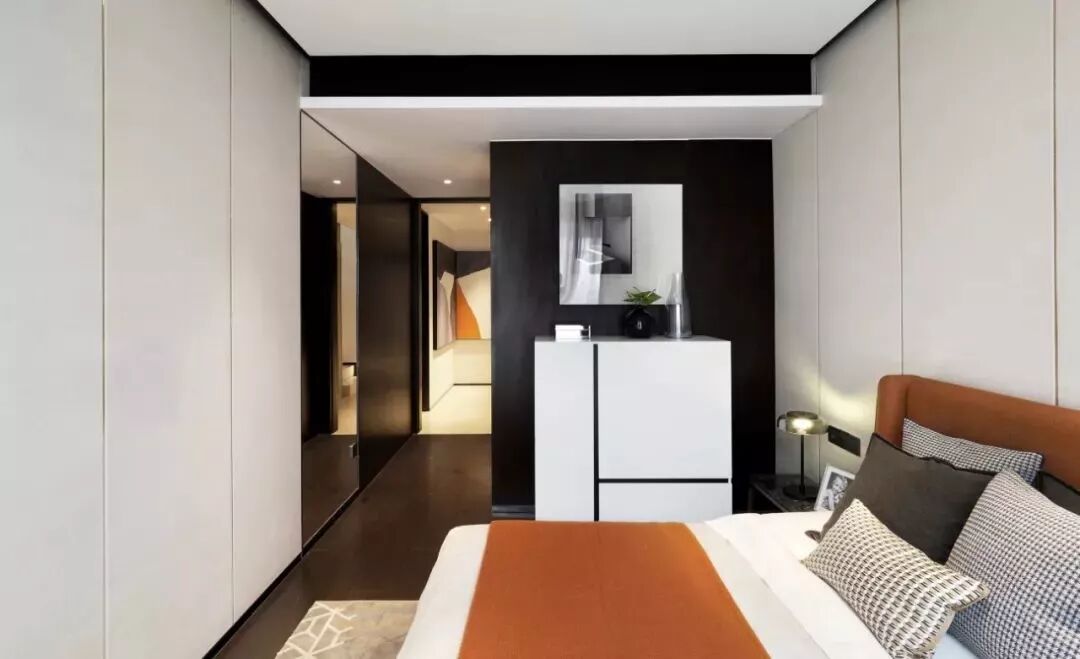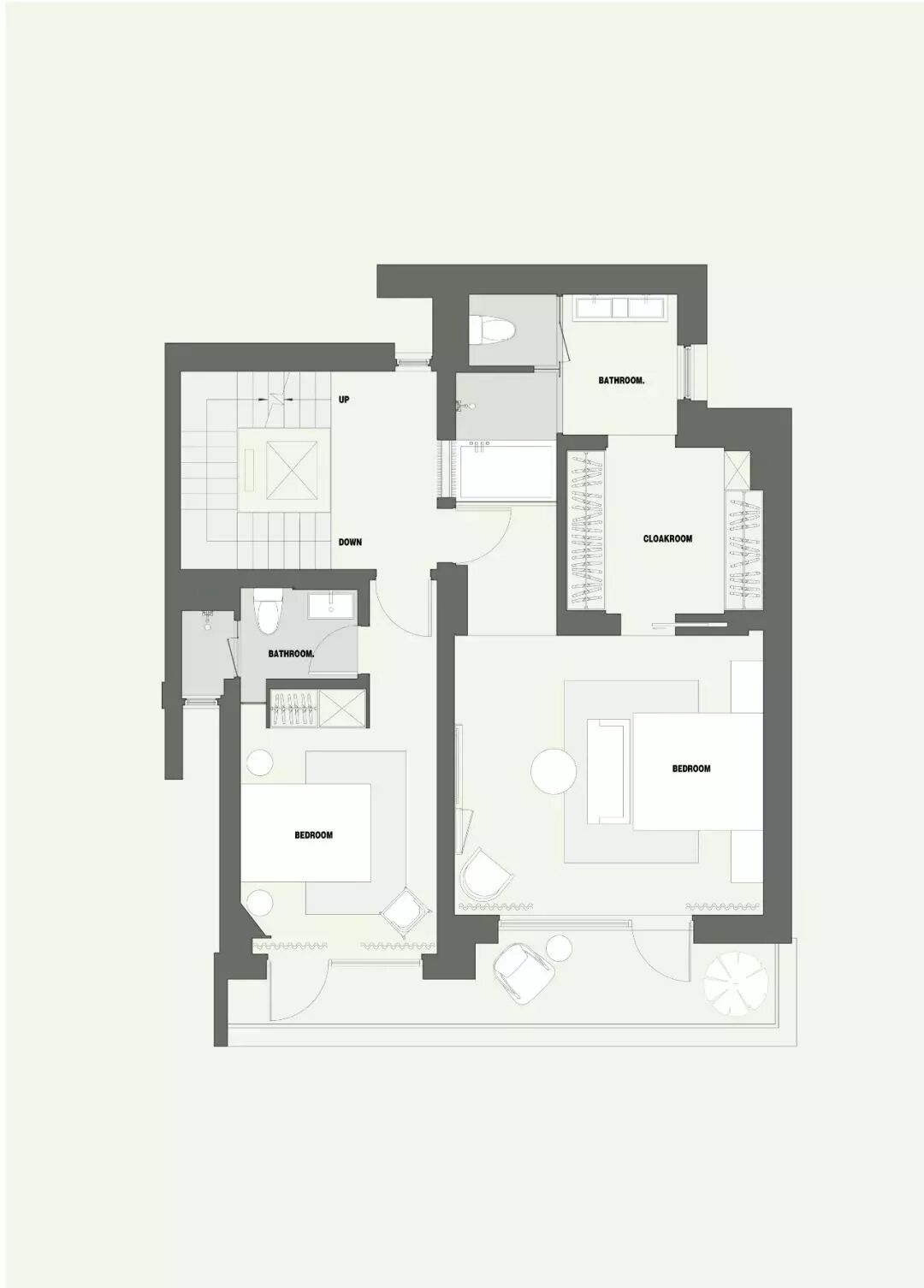 在艺术画作的引领下,拾阶而上,到达二层居住区。主卧系统伺服空间中置,电动雾化玻璃,将私密性和通透性切换自如。空间面纱再一次粉墨登场,不同功能空间之间的功能透析以及非透明状态下的交通问题都由其承担解决。以歙砚制作而成的洗手台盆、隐藏式的下水线路处理、冲淋房阴角弧形处理,以及拼接的考究等处处都呈现出对生活细节的推敲。