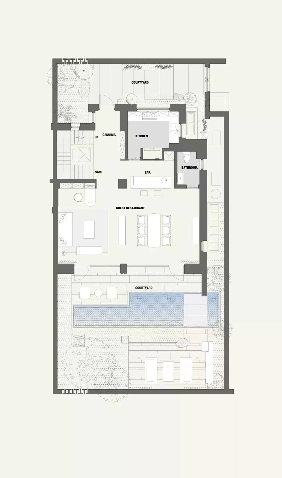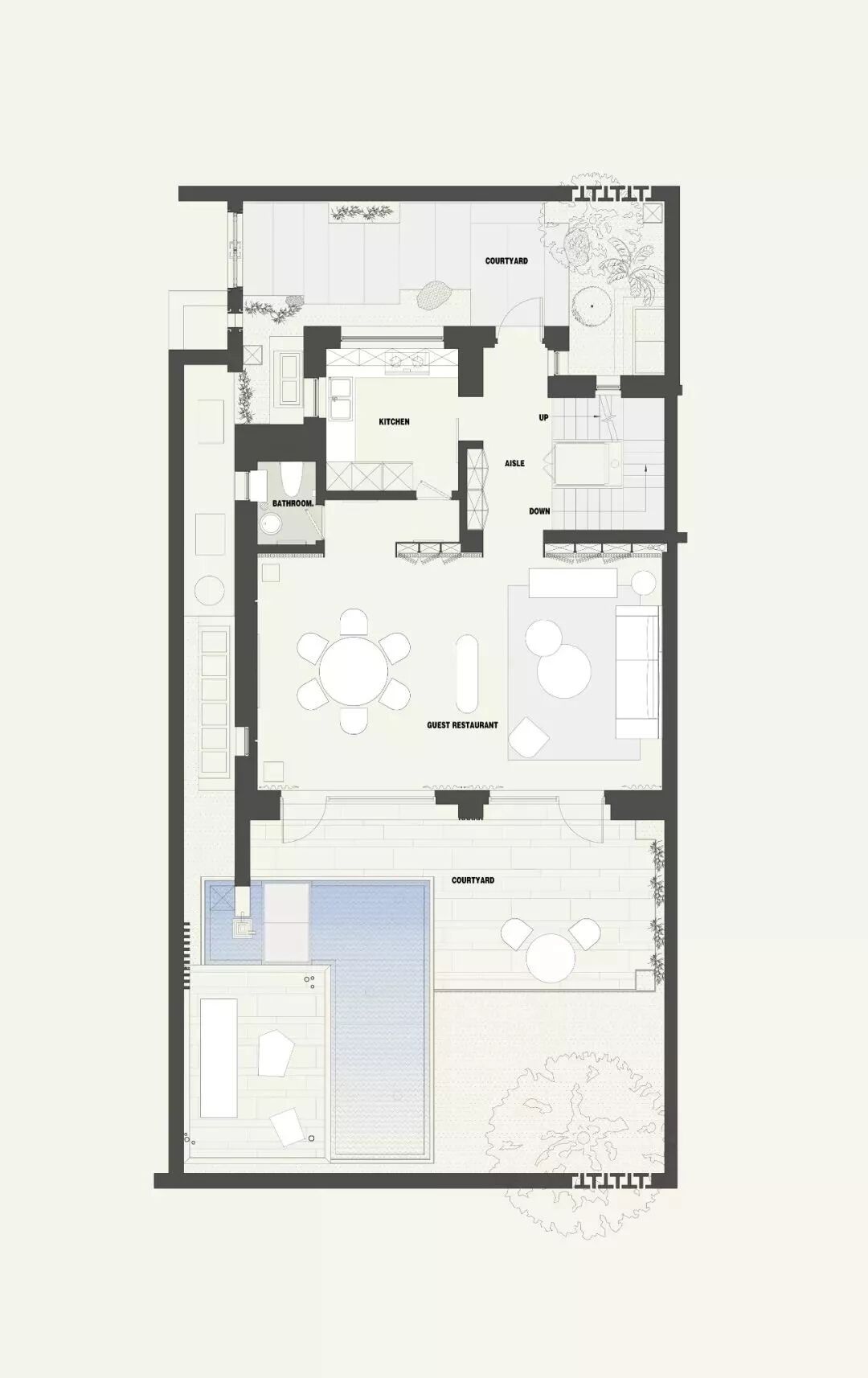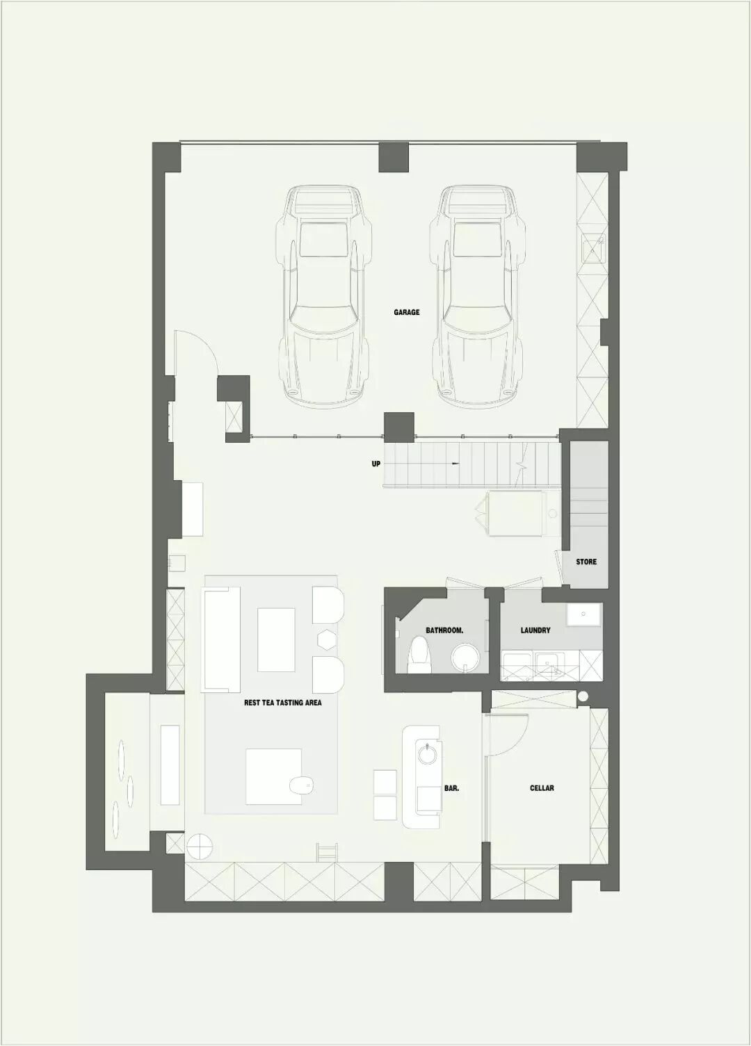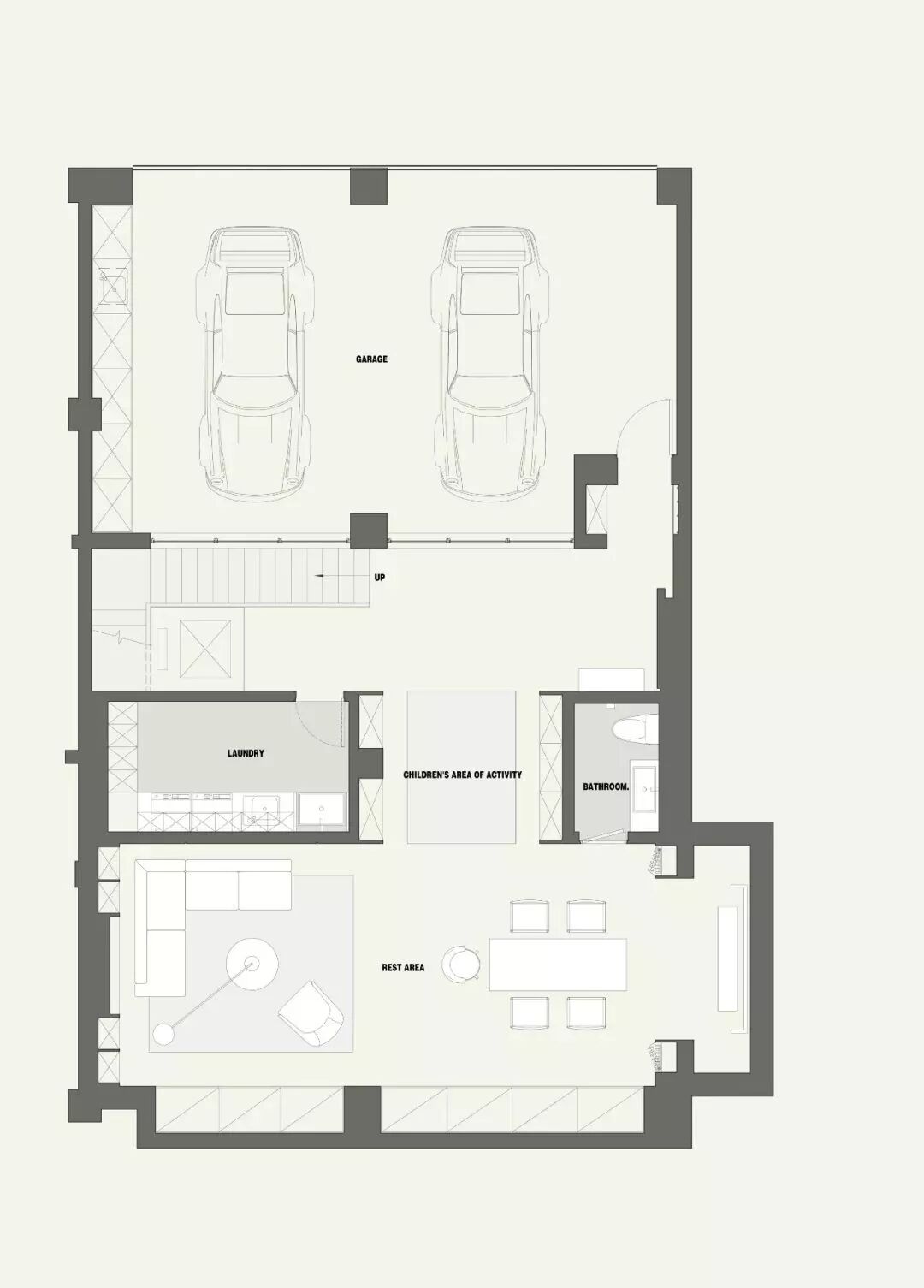 除去南北,还剩一院,翻遍平面也难寻到。人多称之为“天井”,创作者宁可多呈一份尊重,名为“光院”。尽管尺度较小,光院很好地完成了对地下天光的输送及空间气息的循环工作。通过将伺服功能用房中置,地下空间自然的分裂成交通、休闲两大区域。交通与车库贯通,休闲与光院相接。最简练的排列组合营造出带有清爽感的平面功能构成。