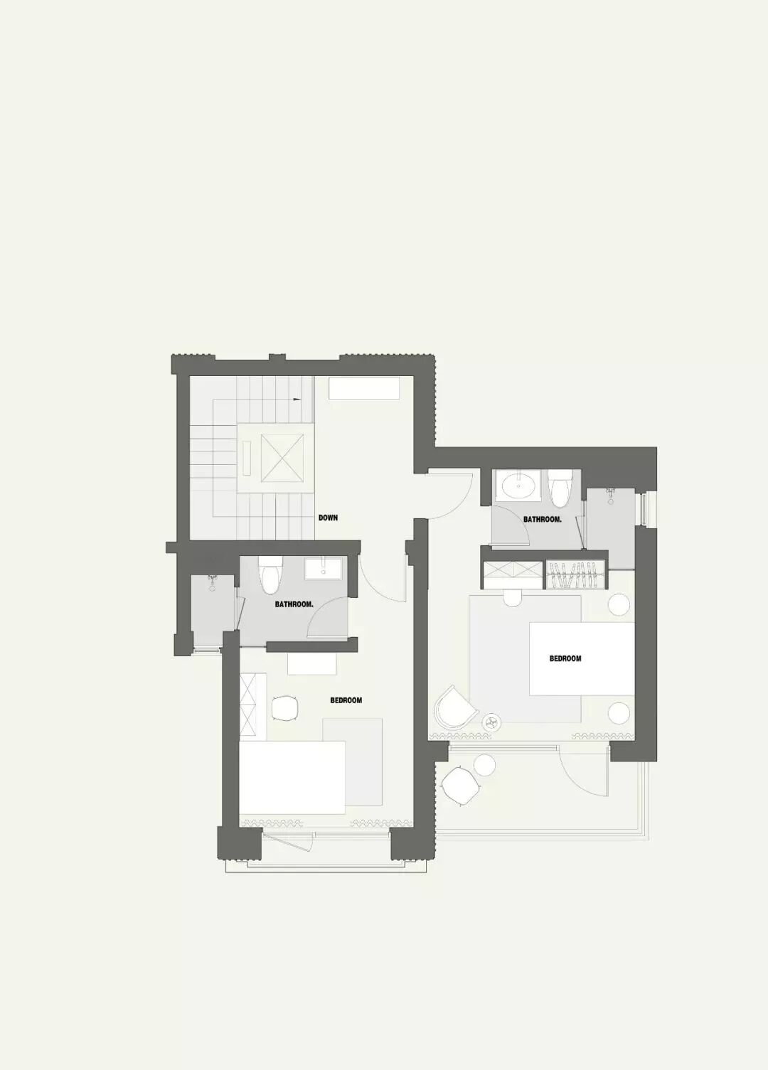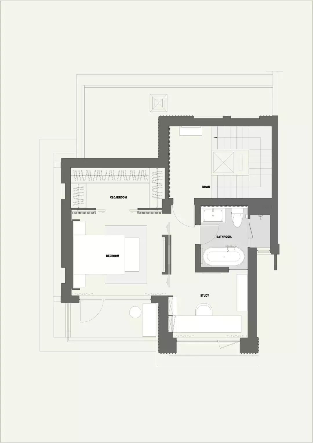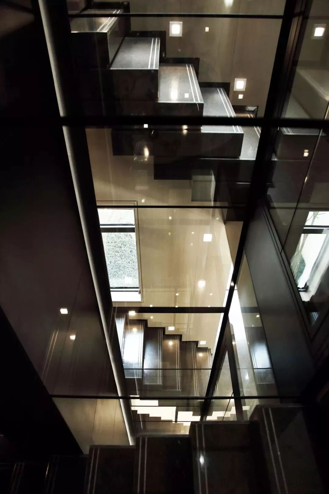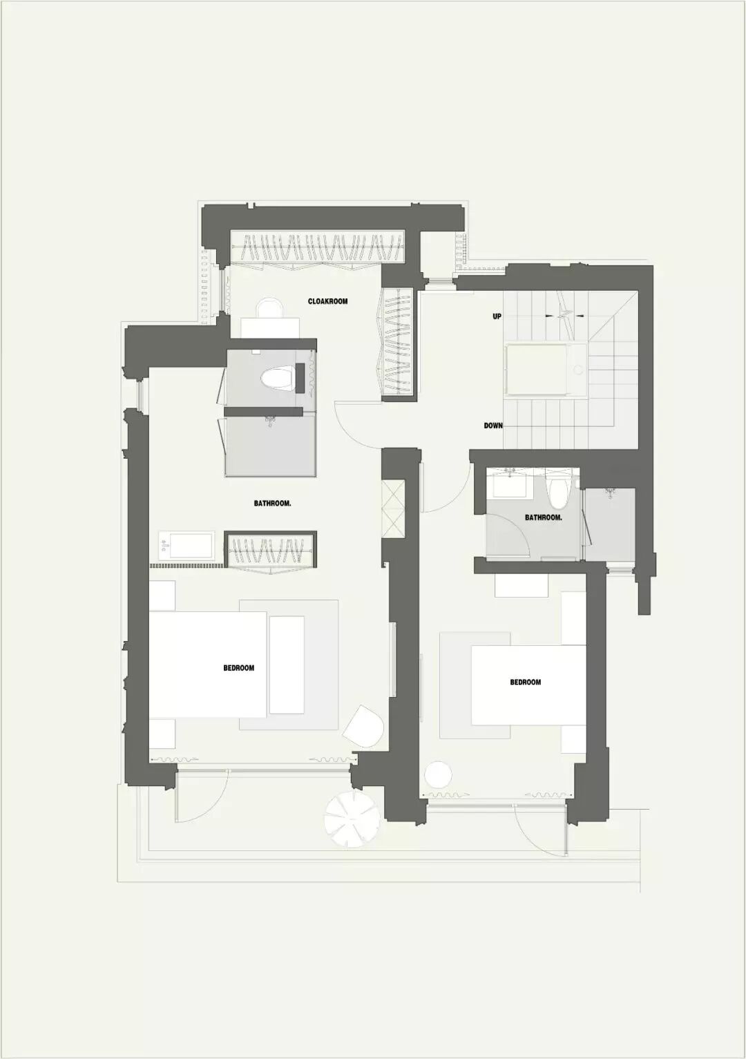 除去南北,还剩一院,翻遍平面也难寻到。人多称之为“天井”,创作者宁可多呈一份尊重,名为“光院”。尽管尺度较小,光院很好地完成了对地下天光的输送及空间气息的循环工作。通过将伺服功能用房中置,地下空间自然的分裂成交通、休闲两大区域。交通与车库贯通,休闲与光院相接。最简练的排列组合营造出带有清爽感的平面功能构成。