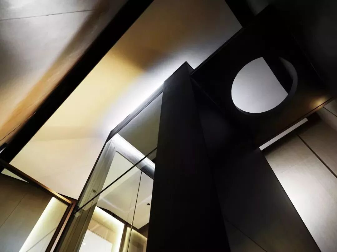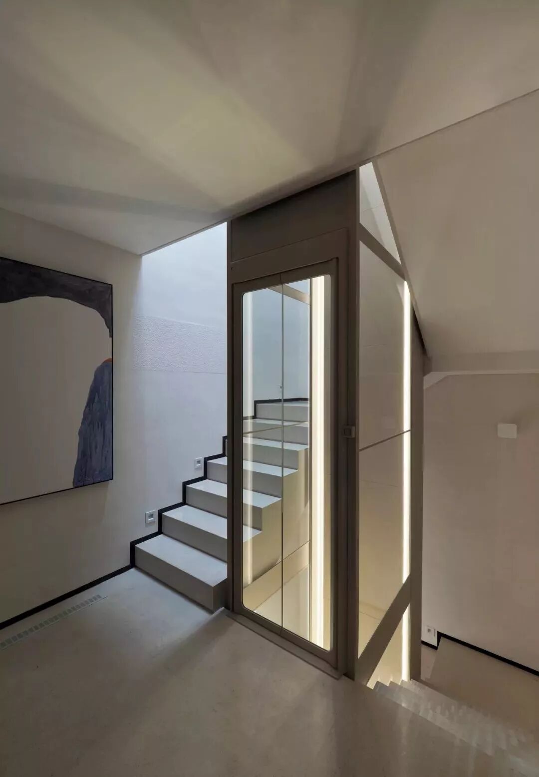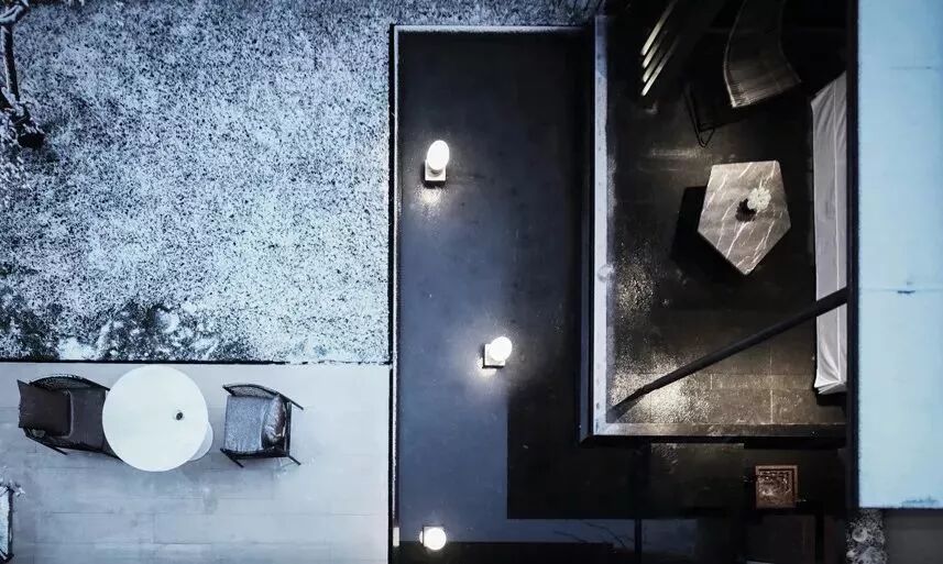 三层面积不大,趣味点不少。首先他用一种度假式居住理念提出一种解决小空间使用的方案,房间与房间之间可分合,户外与室内可分合。电梯厅顶部与原有屋面层剥离开来,形成新的天井,四周缝隙将自然光引入并挤压成束,落于光线昏暗的墙体饰面上,神秘感油然而生。使用者在与顶部光线的互动中,产生了对天光方向的强烈向往。