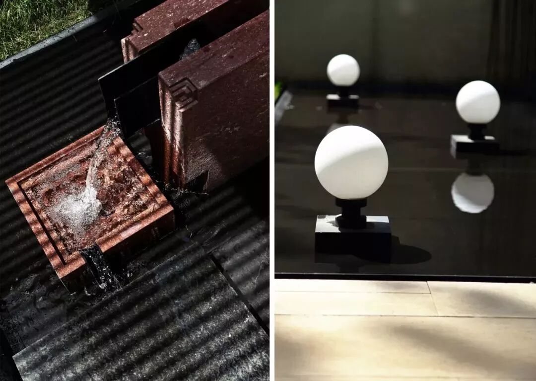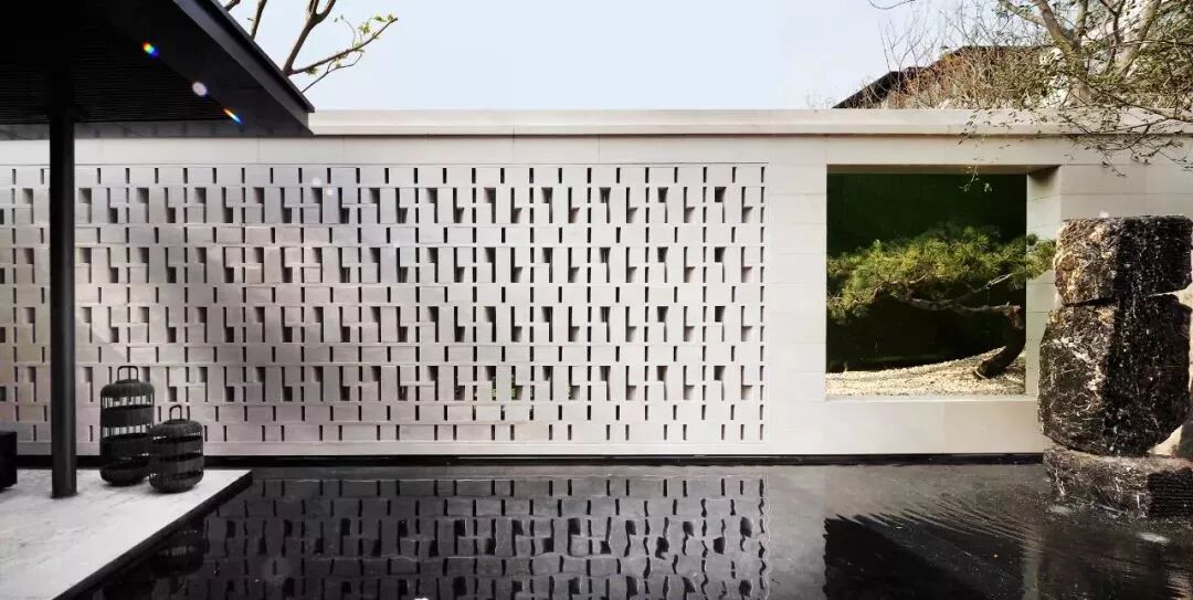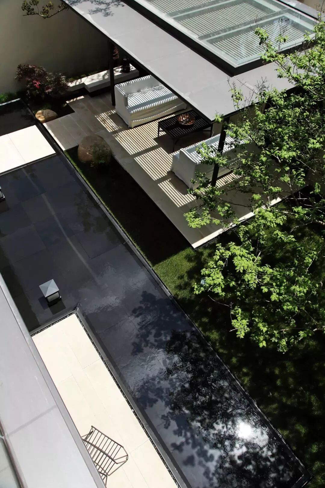 宅有三院,以南院最为明媚。水面、草地、石板以几何形状写意组合。水中有桥、桥有廊、廊有亭,一派萧散简远。尤其以亭的构建为妙,屋面将结构、遮雨、柔光三层关系分离处理,于纵向两排格栅、两组圆柱呈对角布置,释放阳角压力,赢得一片轻松。石墙沉默,涟漪闪烁,独坐幽篁,是非无处落脚,忧喜自上眉梢。水面如镜将风卷云舒、日月星辰、远山魅影一一收纳入这方圆。亭中挂有大型植物画作一副,与周边写意植物形成了强烈的对比。并非随意触发,我们有理由怀疑这甚至包含着创作者有意造作的成分。“生命之境界有隔,我需要一些略显可爱的世俗满足感。”于是,便呈现出如此的率意而为。