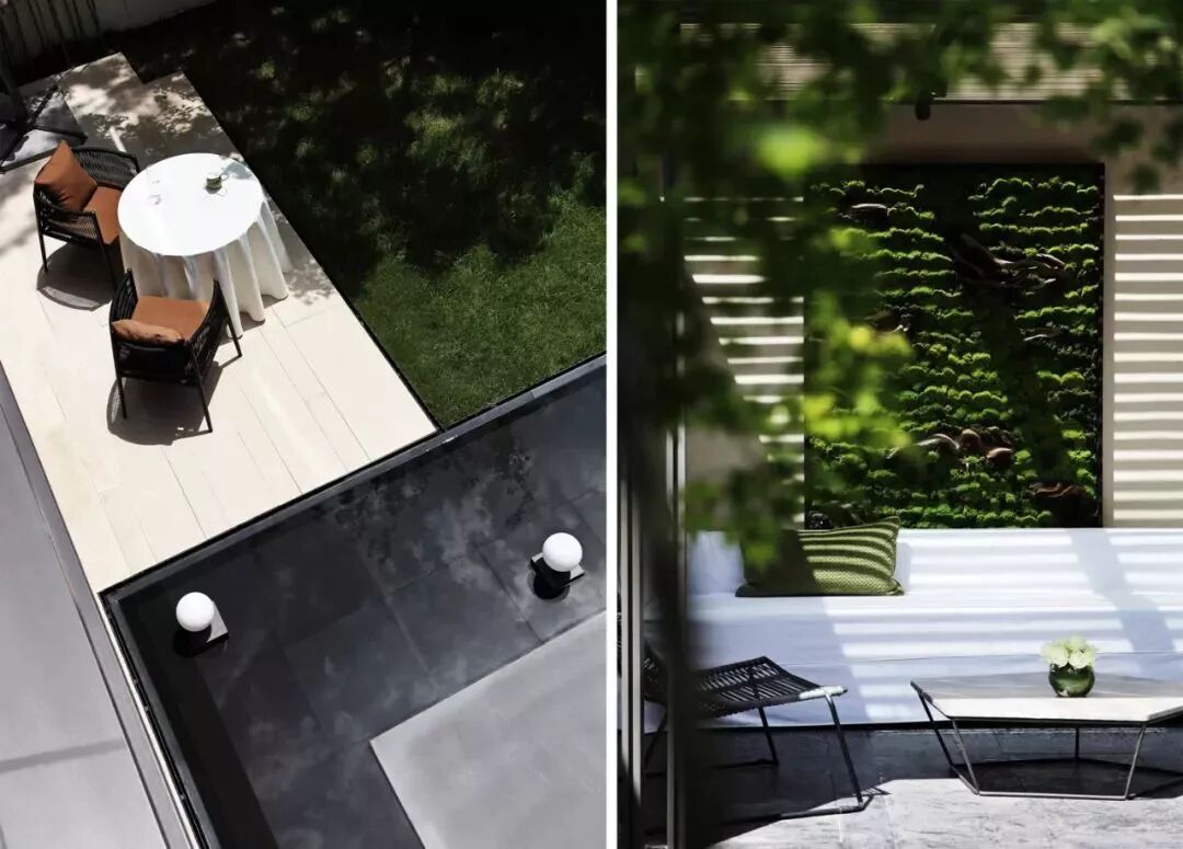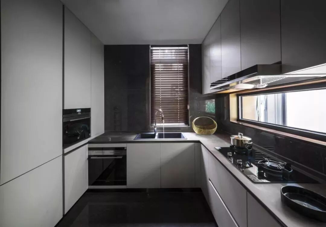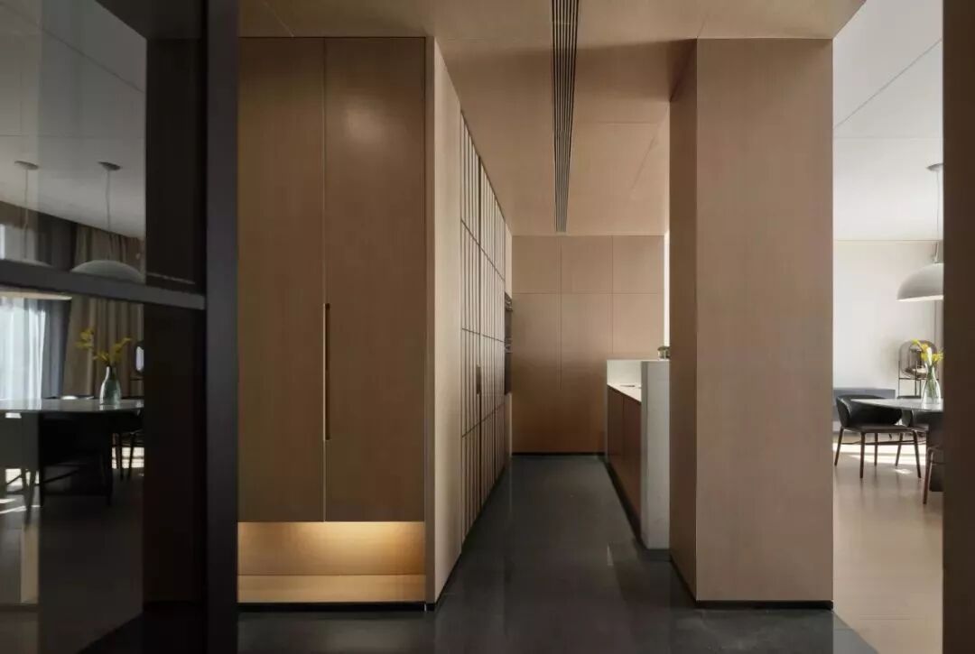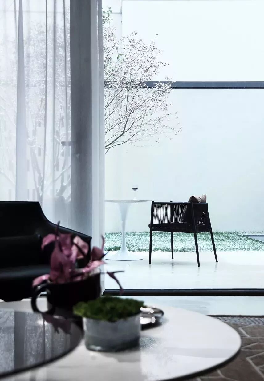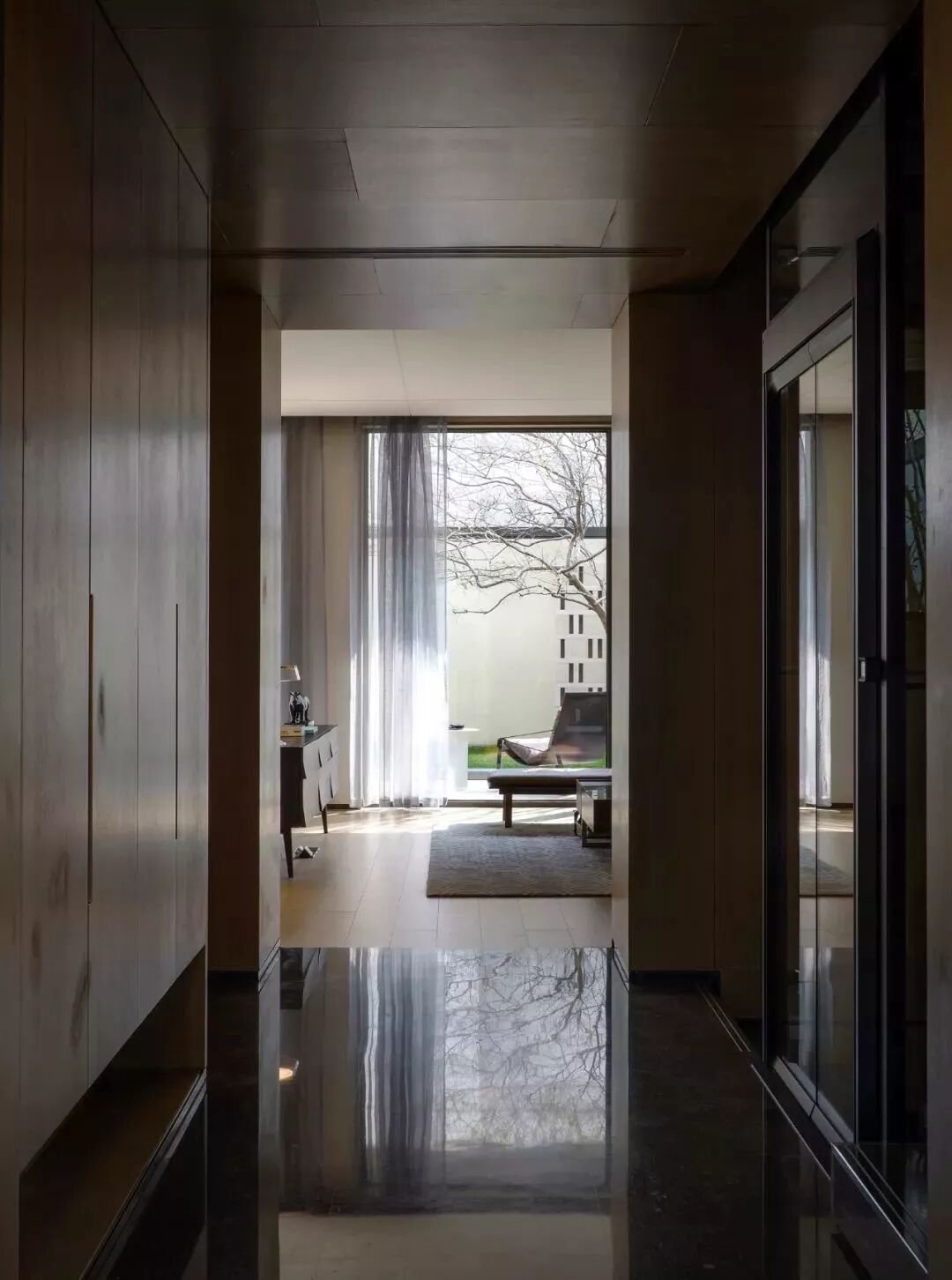 北院入口谦逊、道路转折、雨篷微微下压,高大植物衬于雨篷后、立于天井中。高、中、矮植物分级种植,漫步石径,树叶轻抚身侧,才入家门旋即感受到这份温柔湿润。此时,晚归者映于白墙上的剪影被忙碌的厨娘尽收眼下,透过卷轴般横向展开的窗棂,一时竟难以分辨谁才是画中之人。专业化动线的厨房在家庭使用中很少遇见。出入分置,入口结合门厅,出口面朝餐厅。创作者用一组“空间面纱”序列,利用视觉完美法则,在客厅餐厅部位取得了相对完整、稳定的完美空间。空间的透明边界又与南院呈现出一种无缝状态,模糊了时间与空间的界限,内外空间联系的增强,将人们从建筑有限的内部空间中释放出来。