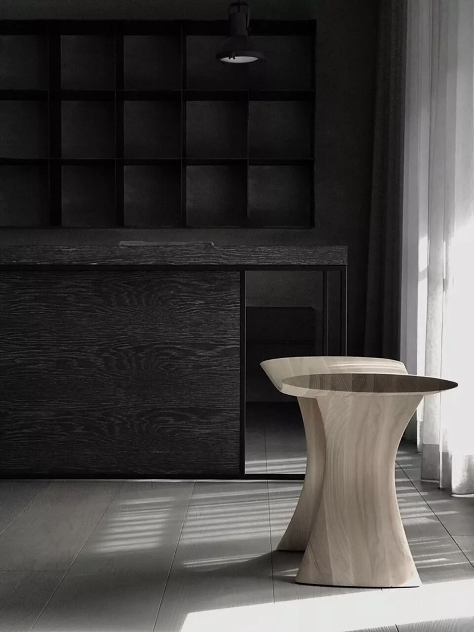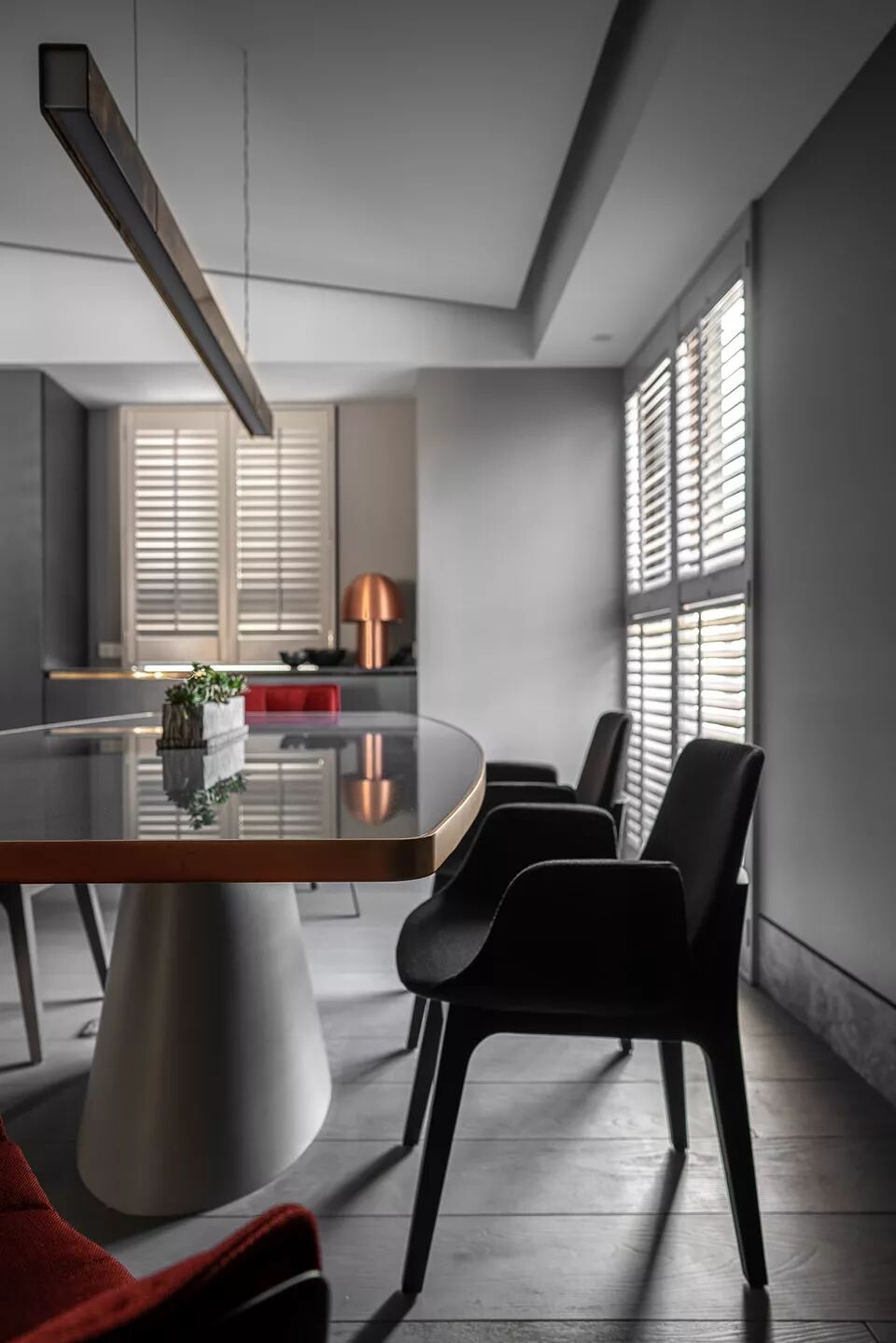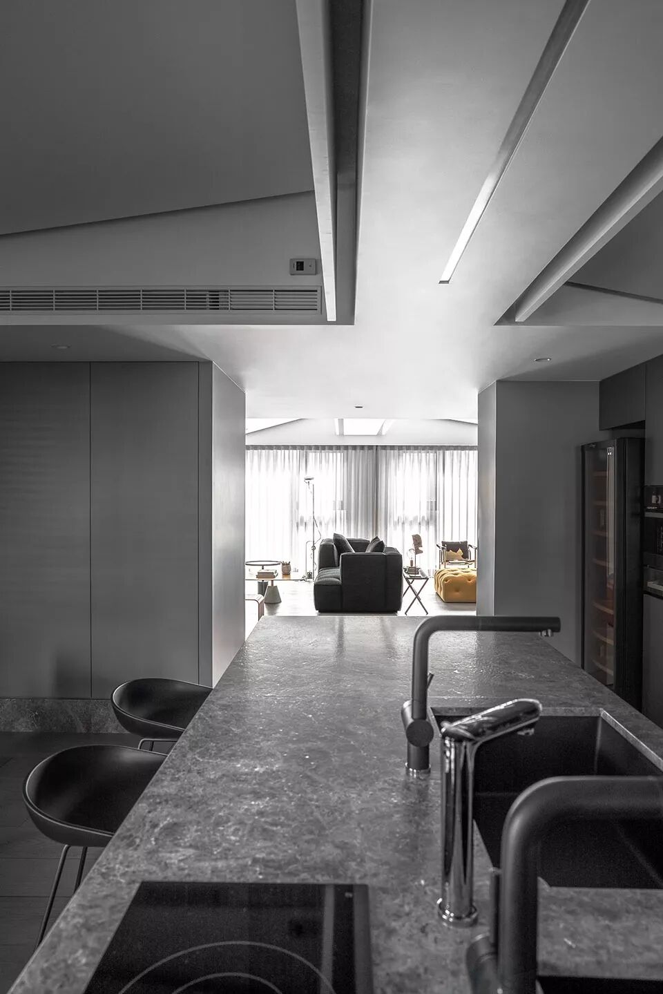 方块几何的变化,使得空间场域尺度的界定被打破,规律、跳跃、律动、随心所至。所有过往成规的条文,不复存在。而斜式顶蓬轴线的延伸,串连了起居及饮食空间。除了延续原有整体灰白的色系,线条简约利落,灰蓝橱柜围绕着空间,搭配手作炙烧的铜质吊灯,光滑平顺的柜体漆面,结合因炙烧而产成质变的铜,其碰撞出的视觉变化,和起居场域的家具一样,如同嬉皮般,追求那份自律性的自由,不在乎别人的眼光,勇敢的活出自己。