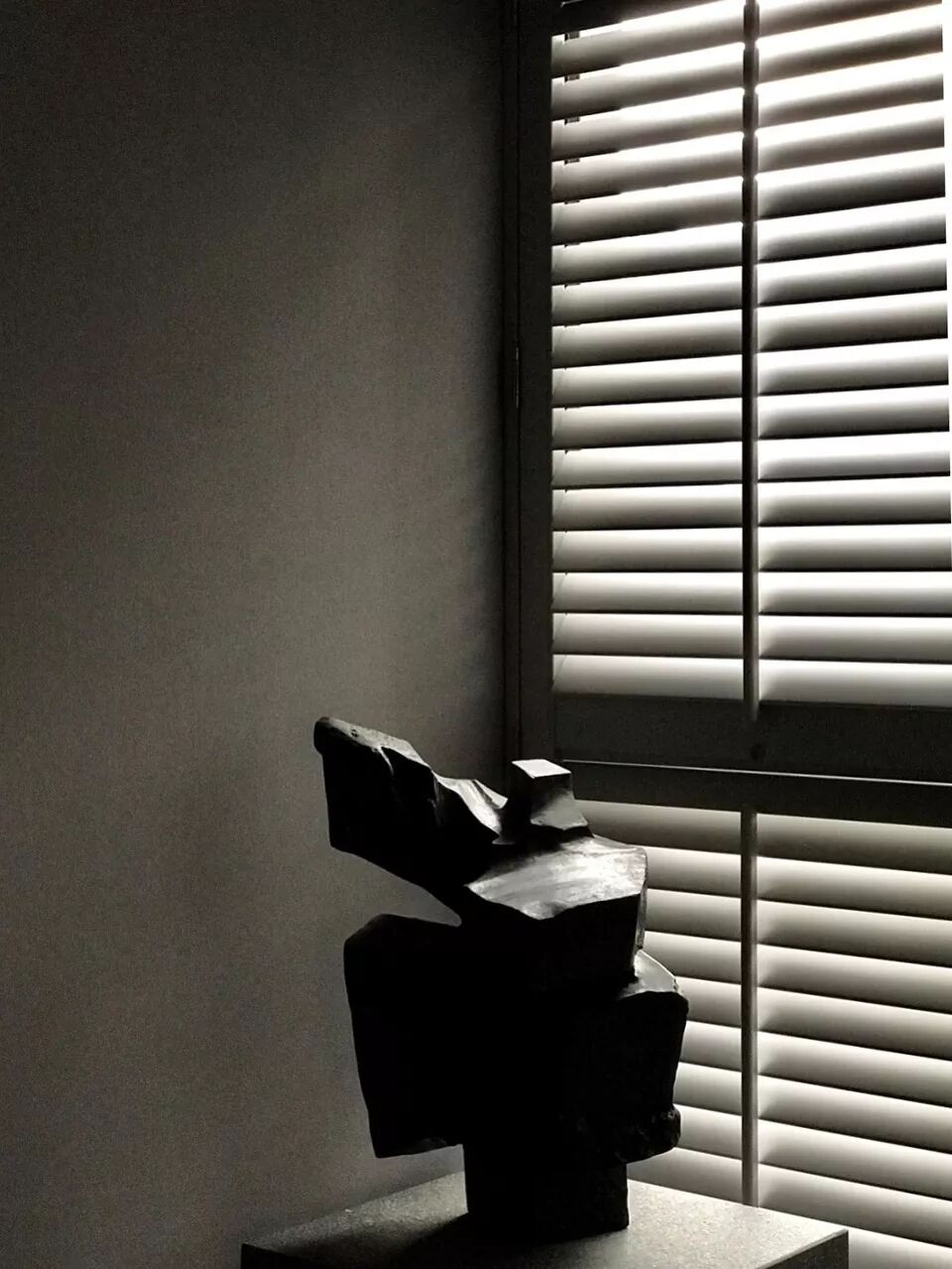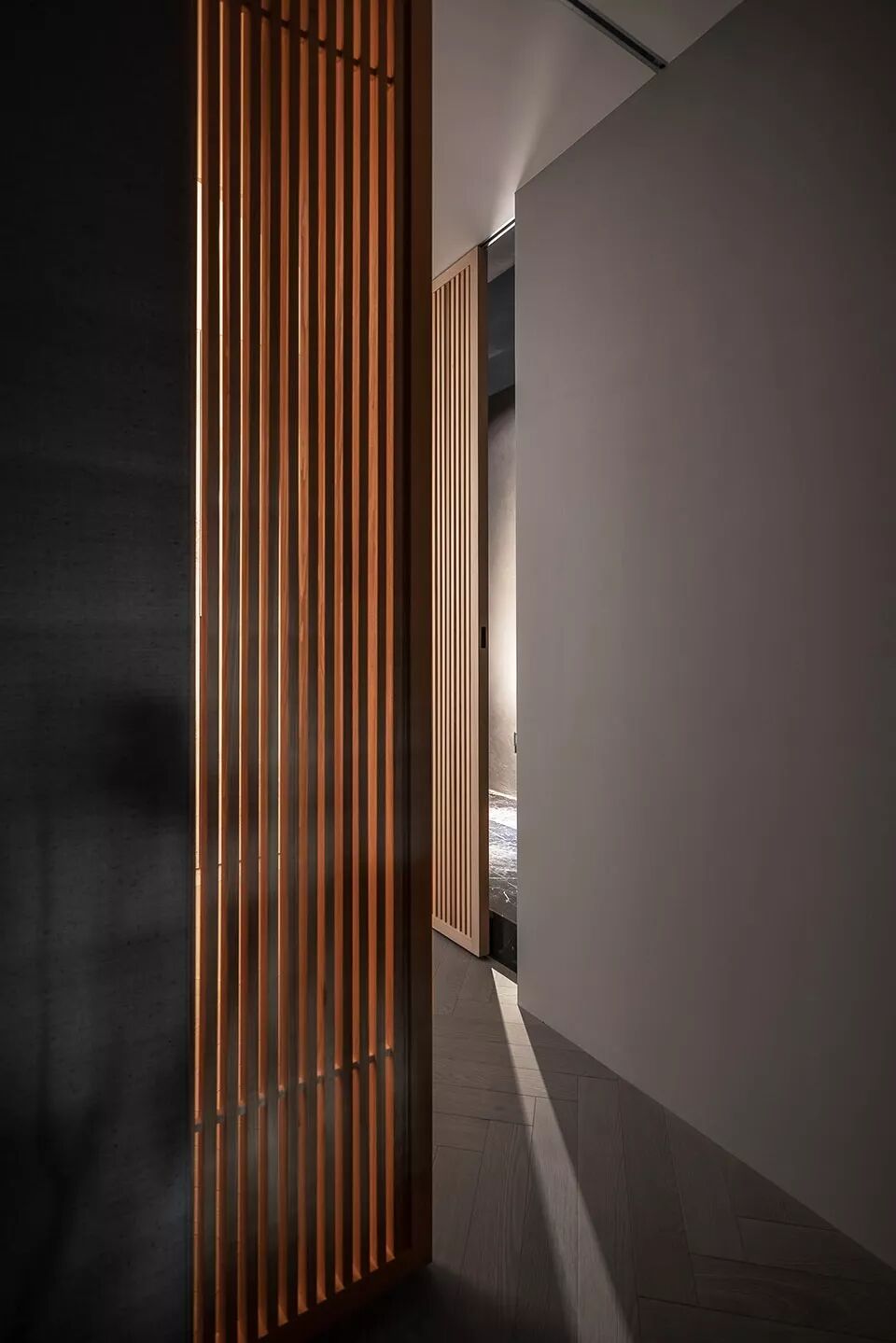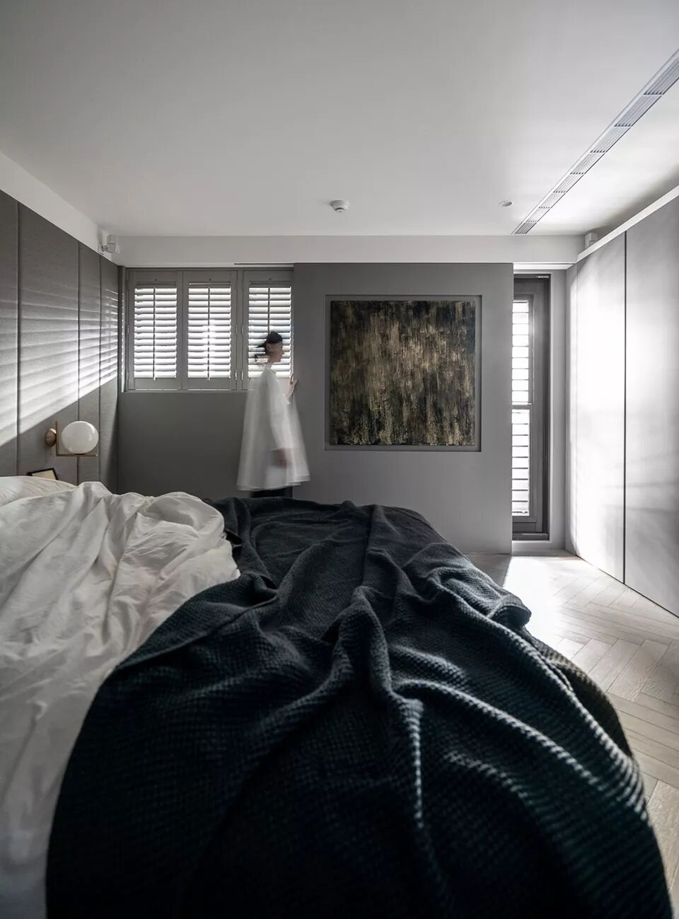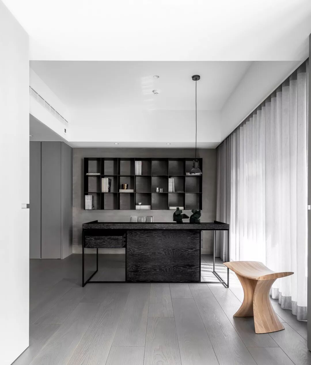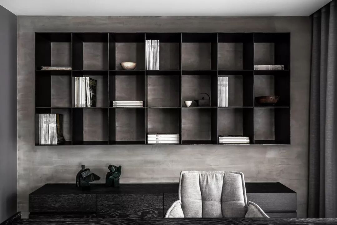 整体空间以灰白为主要色系,中性的色系,亦传达了居者内心中庸之道的那把尺度。灰白淡雅的空间,许多细节隐入其中,灰白仿古面石材踢脚,深邃的沟缝,简易有力地勾勒出立面线条。灰白色的冷喷漆墙面,壁布及石材的交迭运用,使得立面在细节处理上更显细腻。书房水泥静谧的氛围及展示区的铜质及灰质的手工漆面,都增添了空间的精神感受及视觉感受的变化。