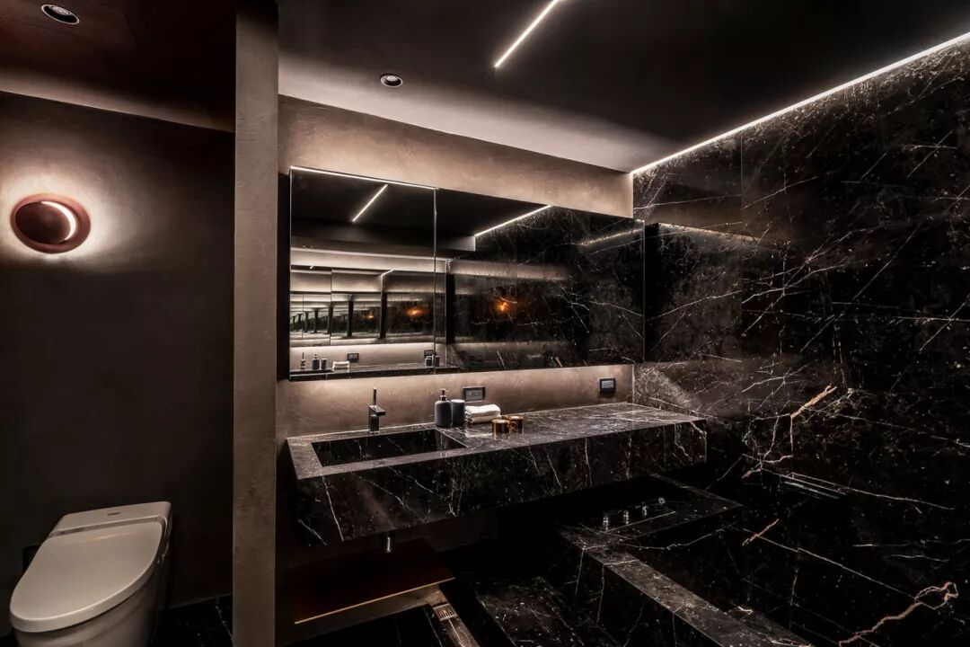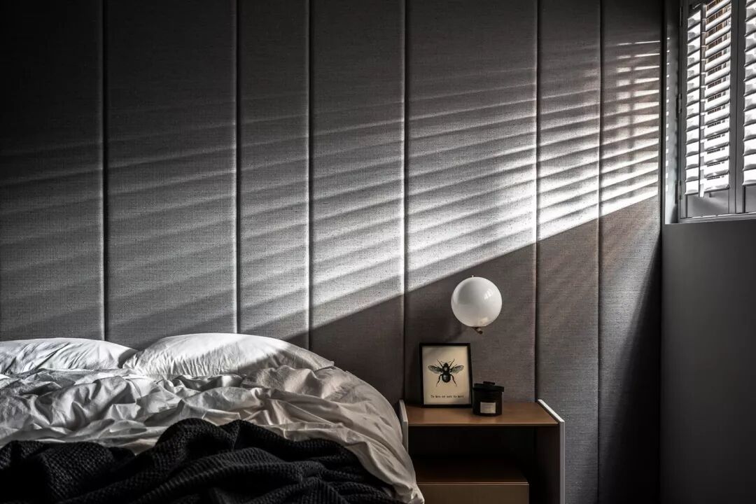 沿着简易淡雅的灰白色壁布廊道,进入了令人舒适的主卧空间。没有过多的装饰表现,多的是一份慵懒撒入室内的阳光及那幅隐喻居者内心刚毅的创作。减少干扰后的那份平淡,不正是主卧空间应回归的原貌。主卧浴室以黑色为主要色系,给予人们神秘的感受,然另一层面而言,黑亦代表着时尚。古朴质感处理的蛇纹石黑白纹理,赋予黑色神秘一种蕴含层次的变化,散发诱人的气息。