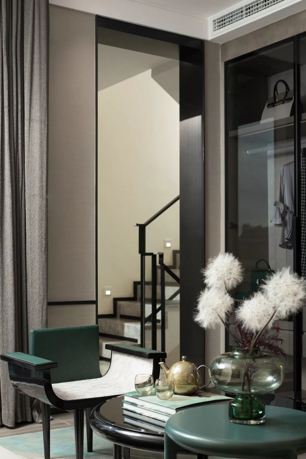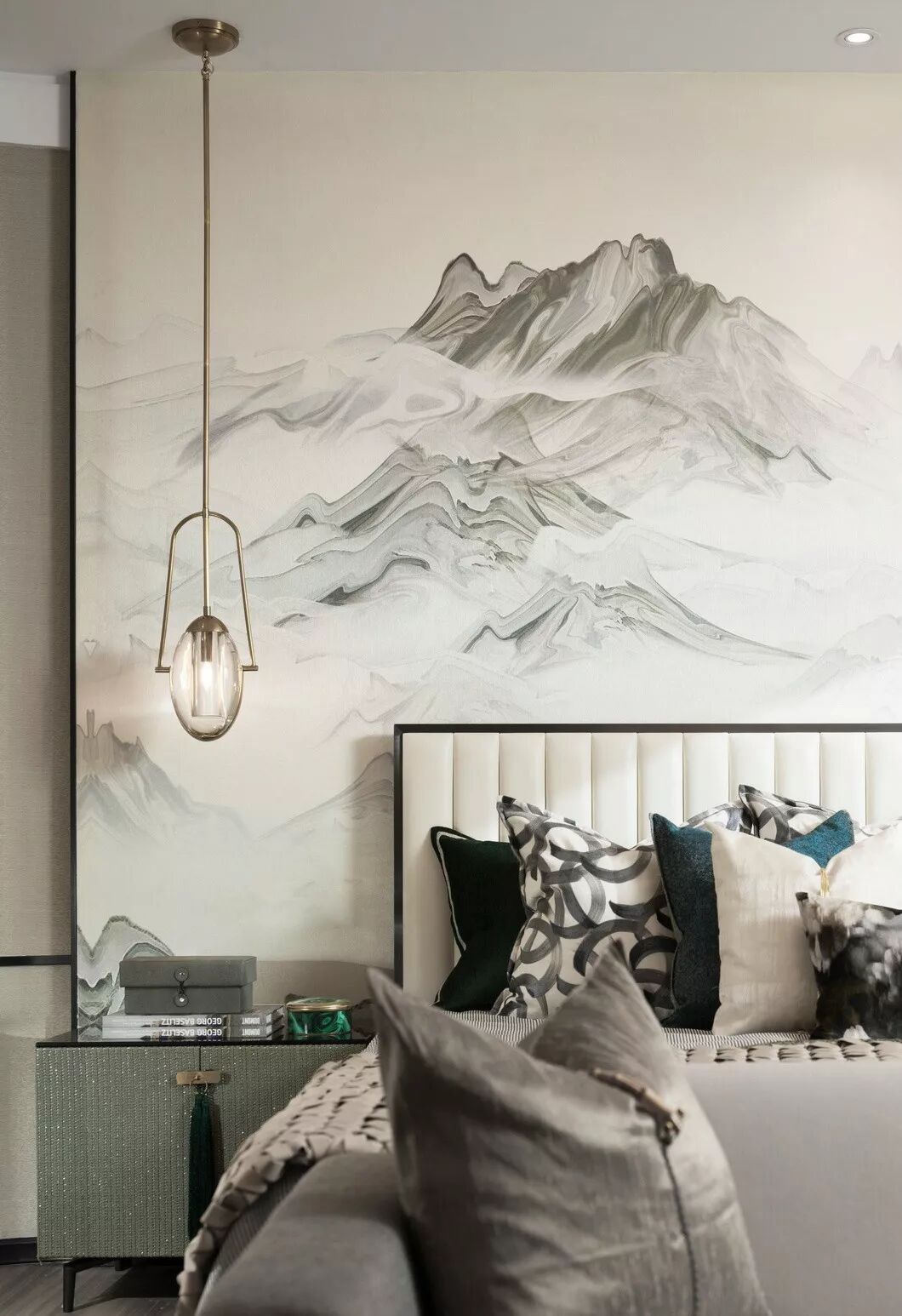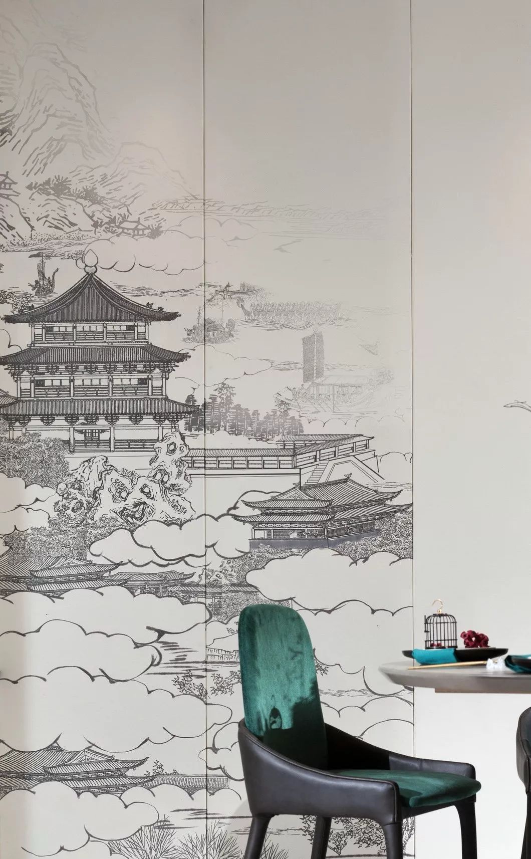 墨绿色蔓延开去,一份韵味弥漫在空间。行云流水般的肌理,与皮质的相知感,蕴藏着心灵互通的深意。山水渲染开去,天地被纳于客厅一偶。