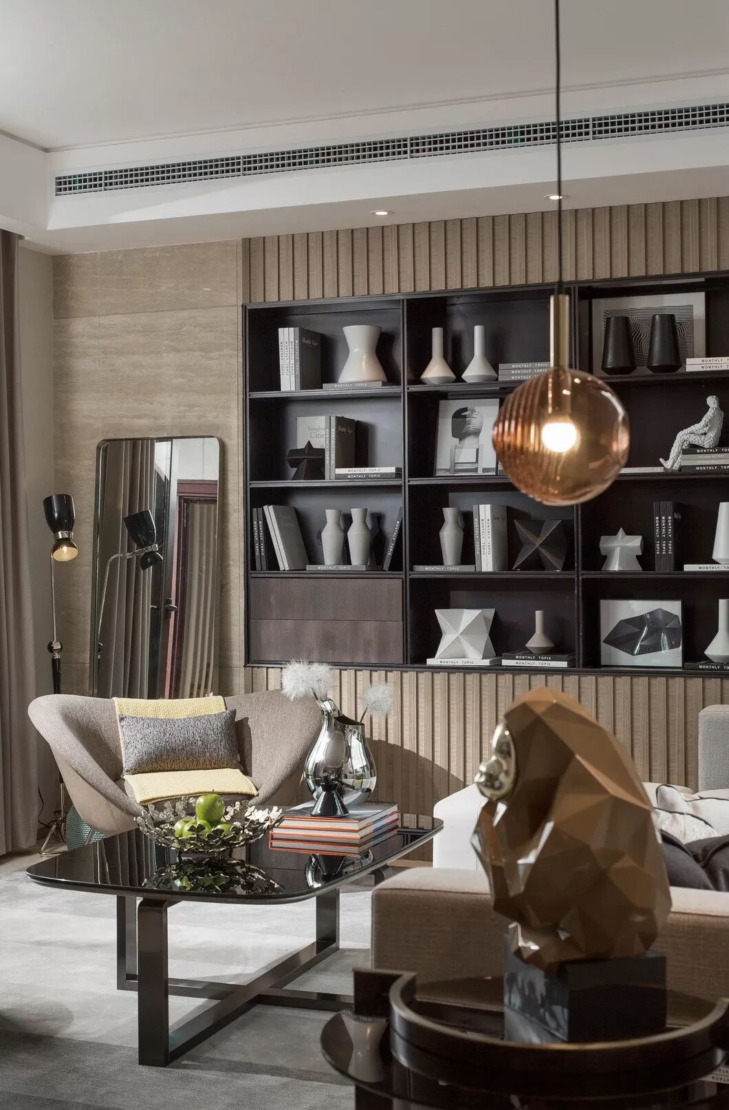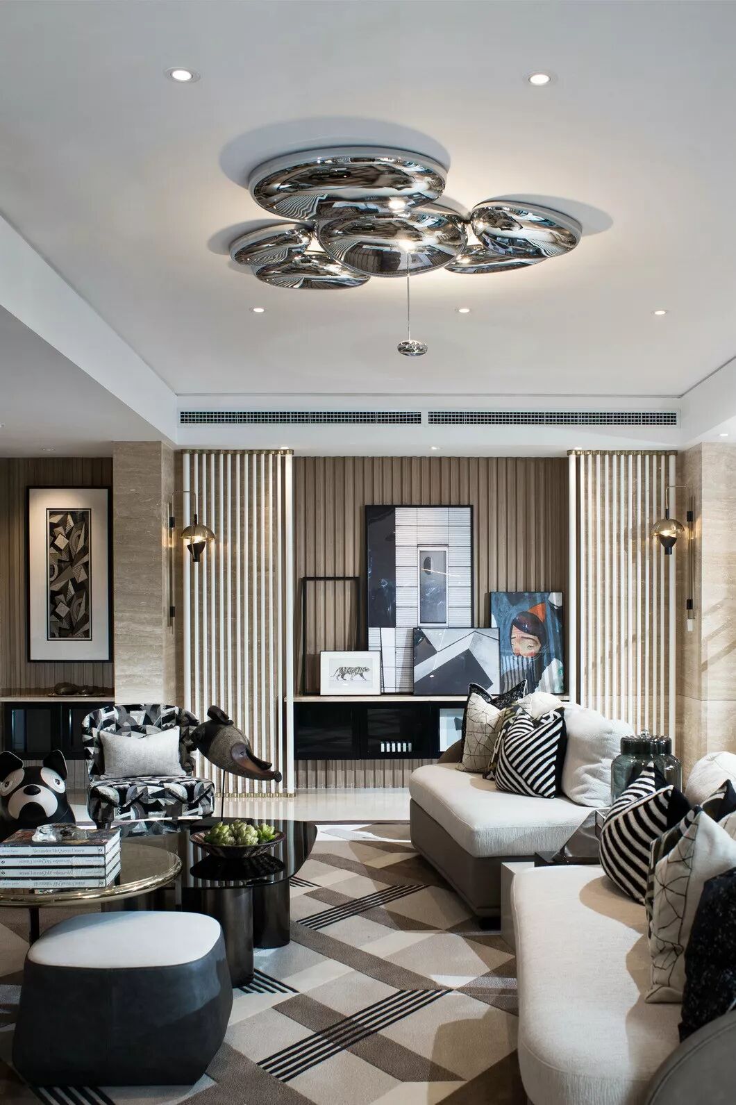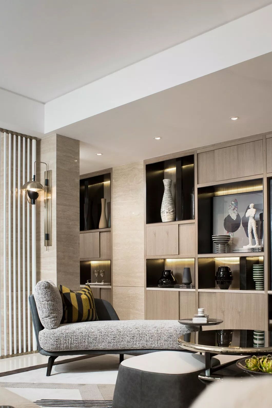 纳沃设计在空间中引入现代简约的美学精神,以米咖色为主调,不同饱和度的黑灰色系加以花纹、条纹等元素加以点缀,定义空间的现代艺术风尚。