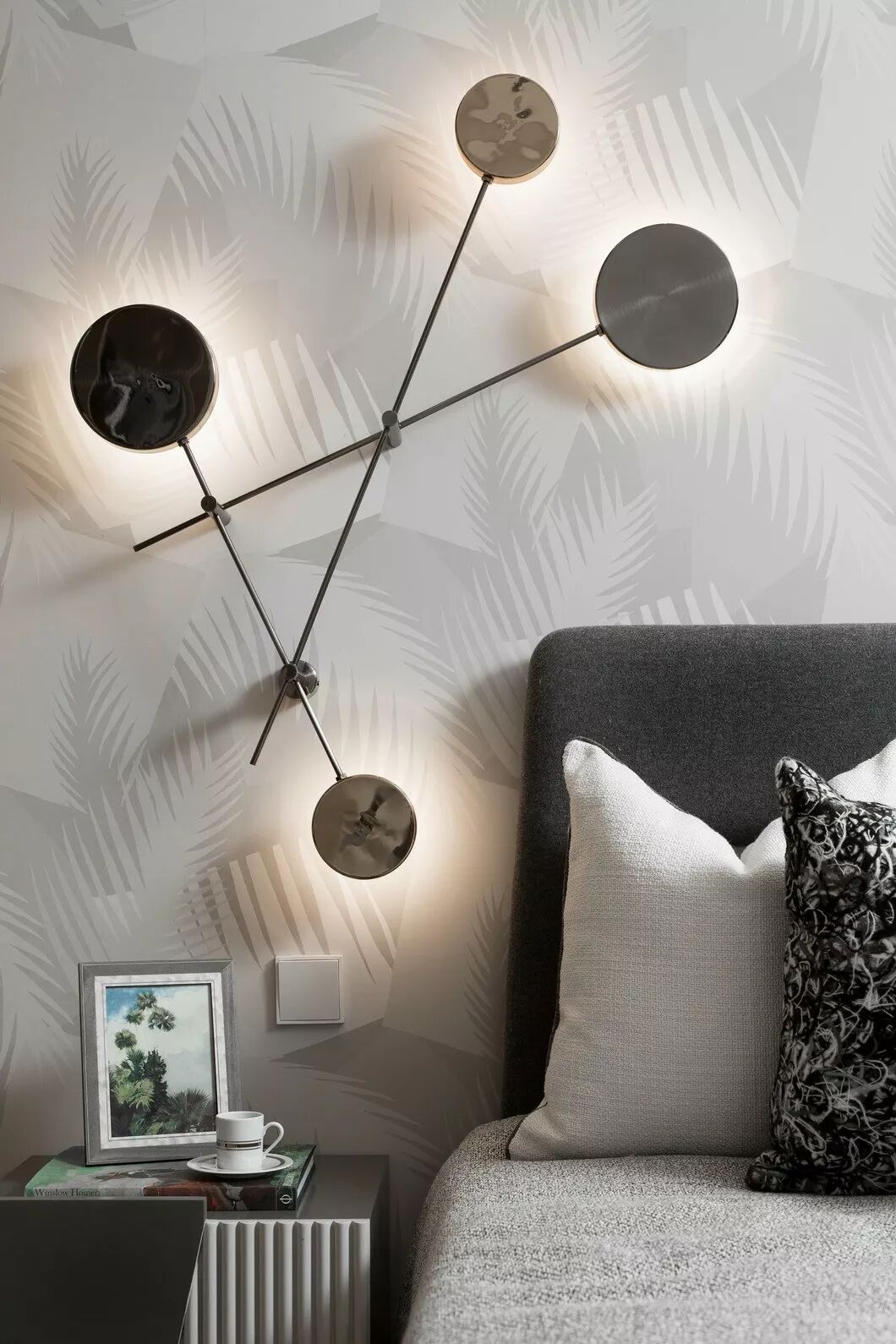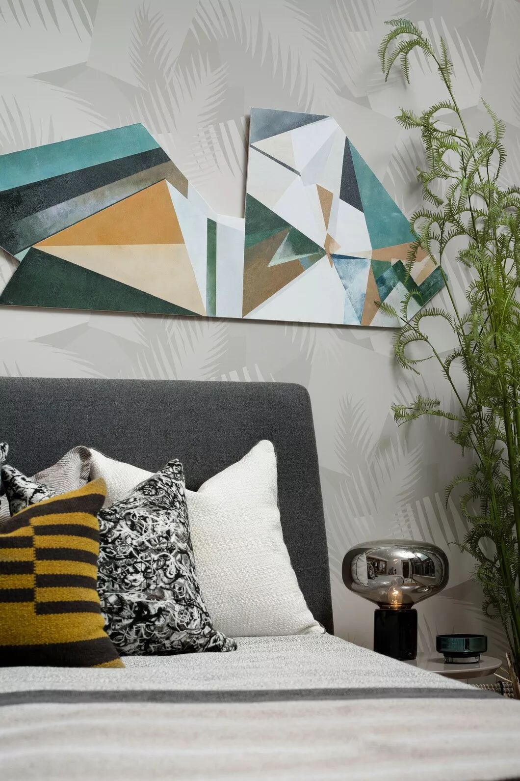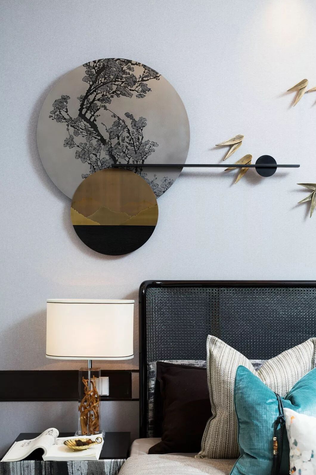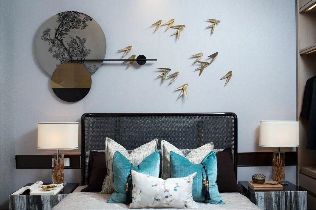 次卧空间在设计师的巧思布置下线条多而不杂,平和静谧。几何元素的墙上饰品,与室内色调和谐互融。