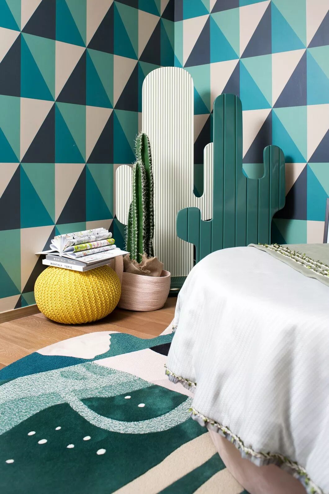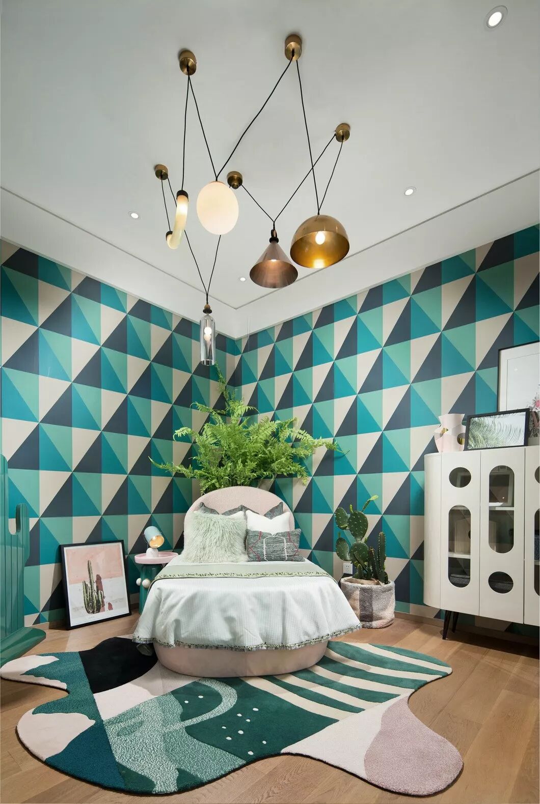 时尚的几何格纹增添了女孩房空间的趣味性和气质美,几何墙纸加以独特的灯饰,使得在凝聚视线的同时,产生新的空间张力和视觉想象,局部细节搭配以绿植和仙人掌造型饰品,感染着身处其中的个体,在清新悦动的空间环境下更接近自然,映衬出返璞归真的初心。