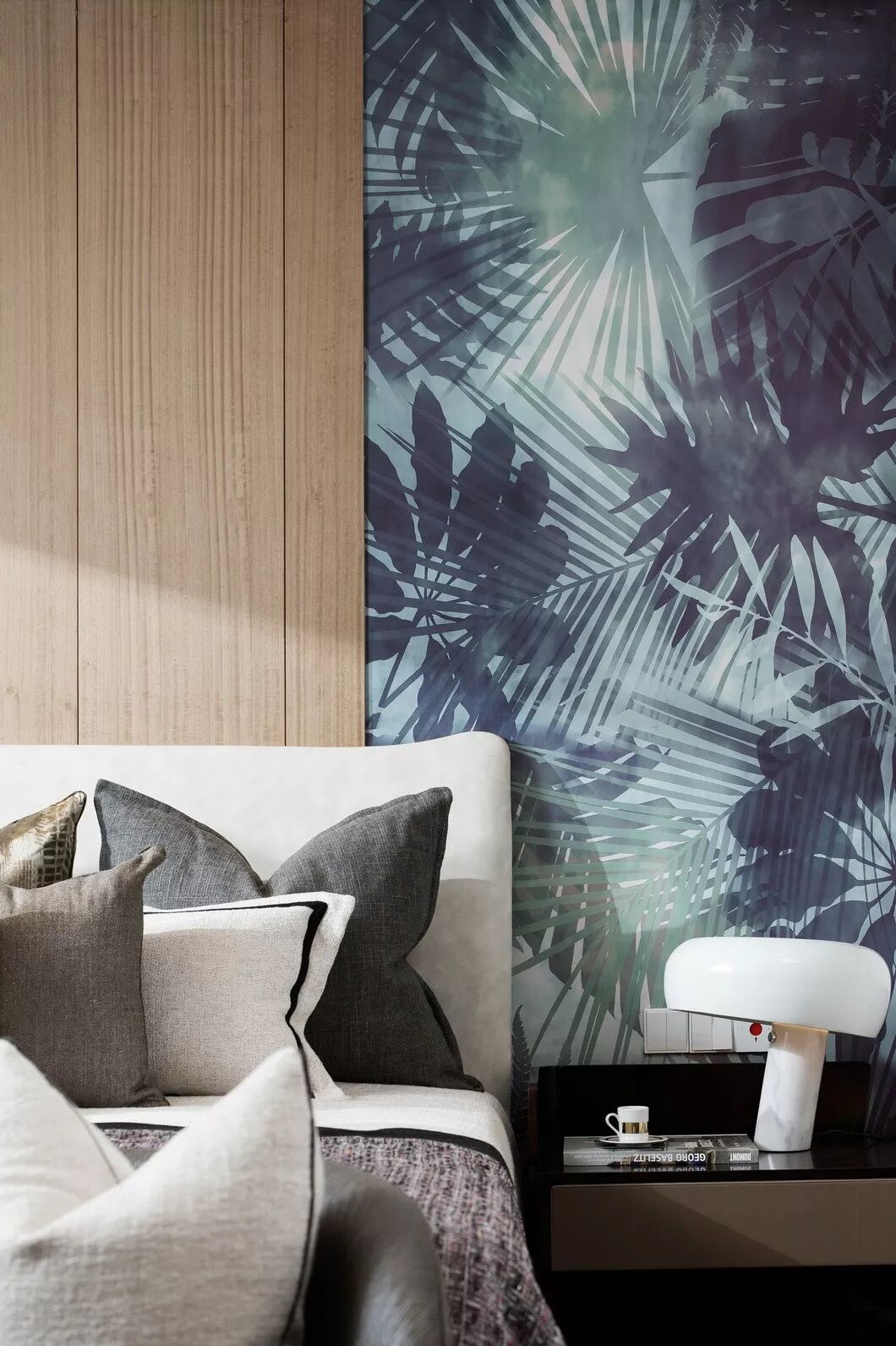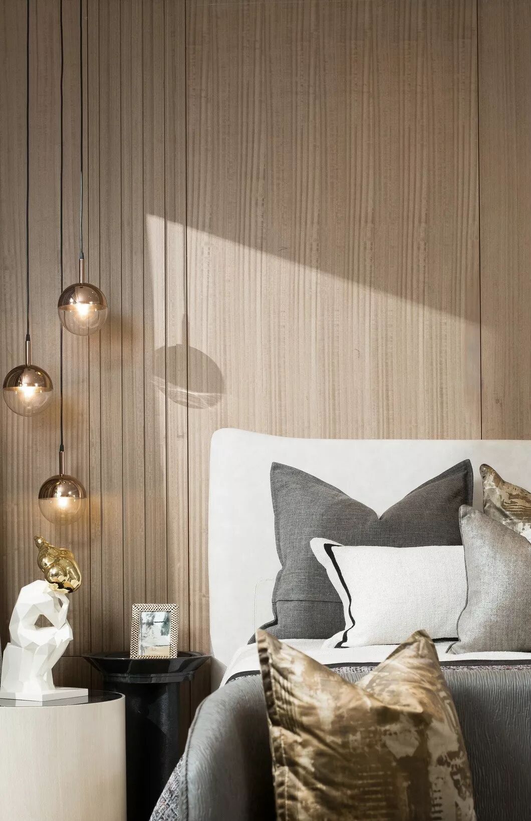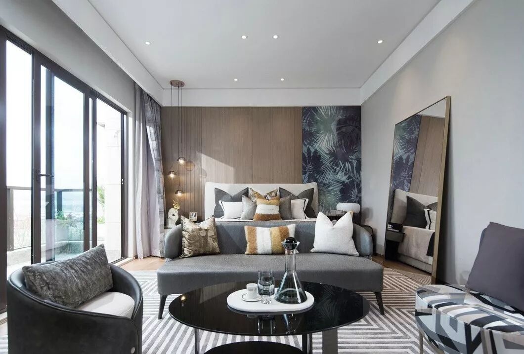 主卧的空间色彩上依然是以原木色和灰色为主,加以部分花纹图案作为点睛之笔。空间的每个家具都优雅精致,每一盏灯的造型均别具一格,以现代美学语汇的雅致与简洁,营造着时尚典雅的气韵。