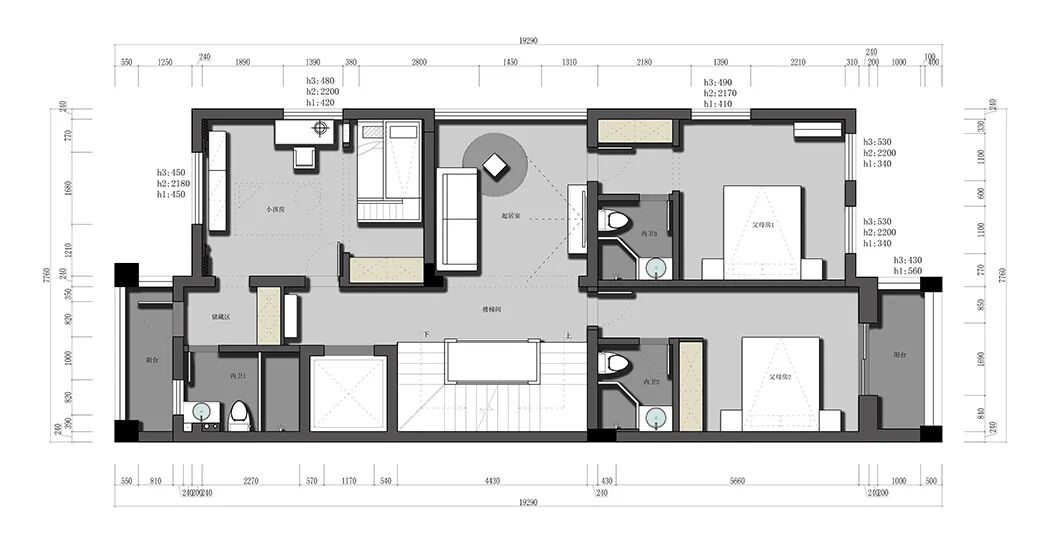 二层部分则为父母房空间及儿子房的私领域空间,循着原木色的楼梯,营造丰盈气质的轻雅风格,独立而静谧。