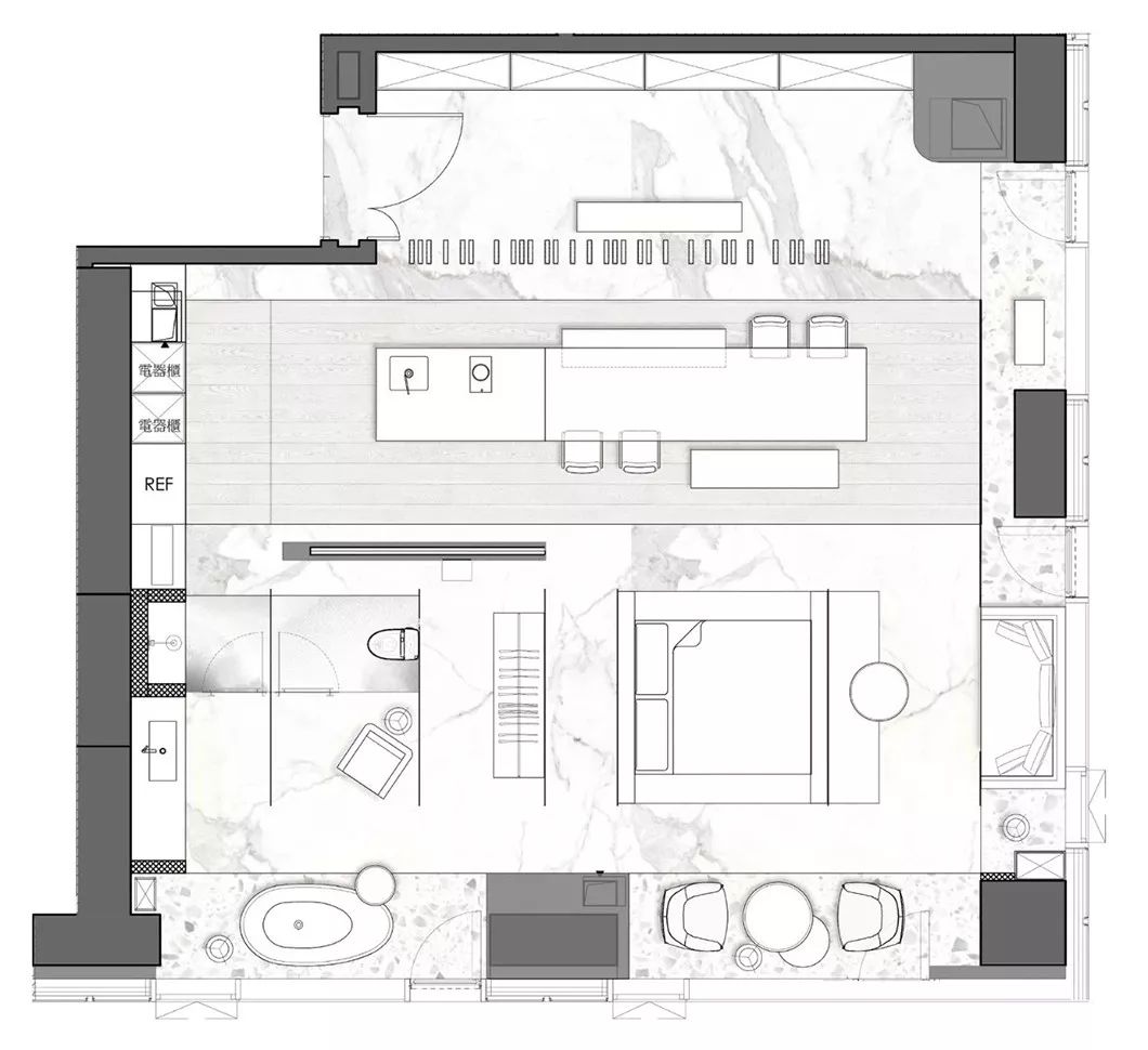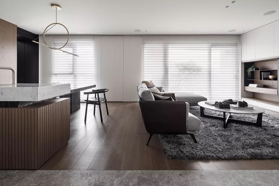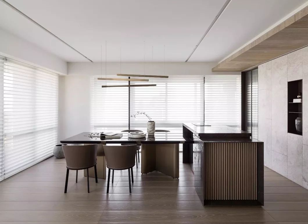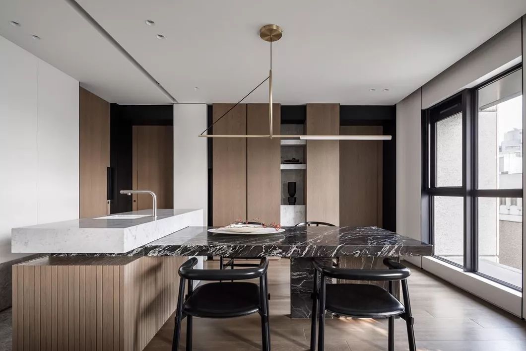 经过玄关进入整体开放式的区域,包含西厨中岛、餐厅、客厅兼书房等功能区域,开放式的家庭中岛作为住宅的核心主轴,利用中岛的量体创造空间中的主要格调。