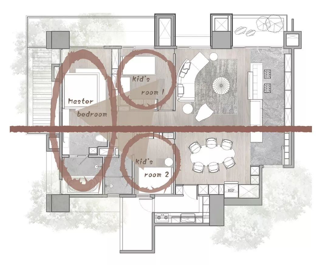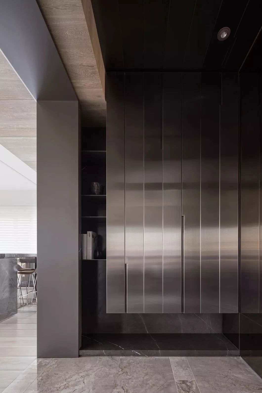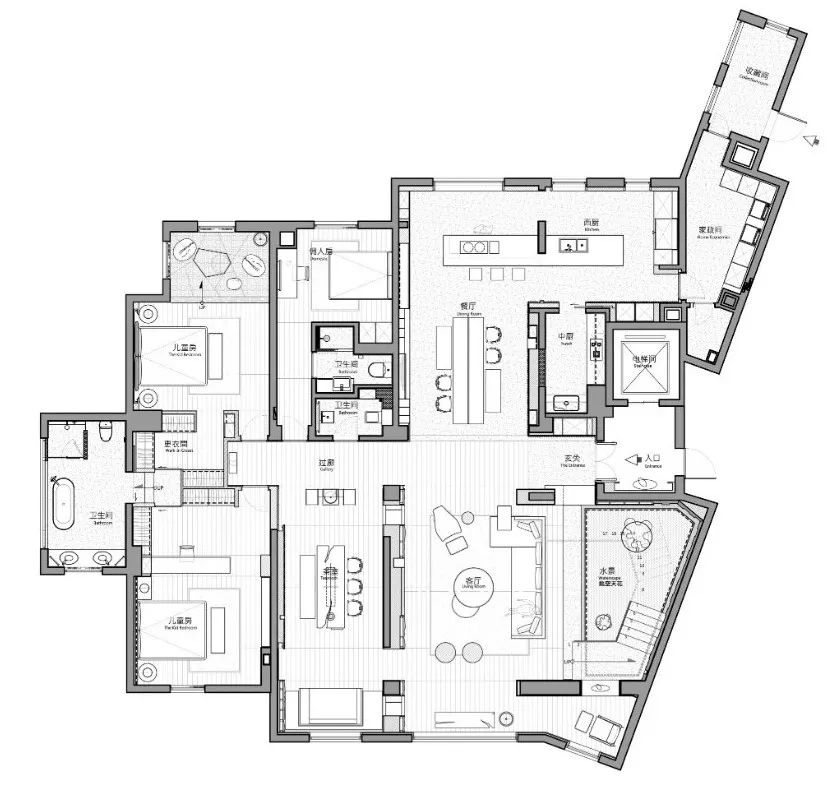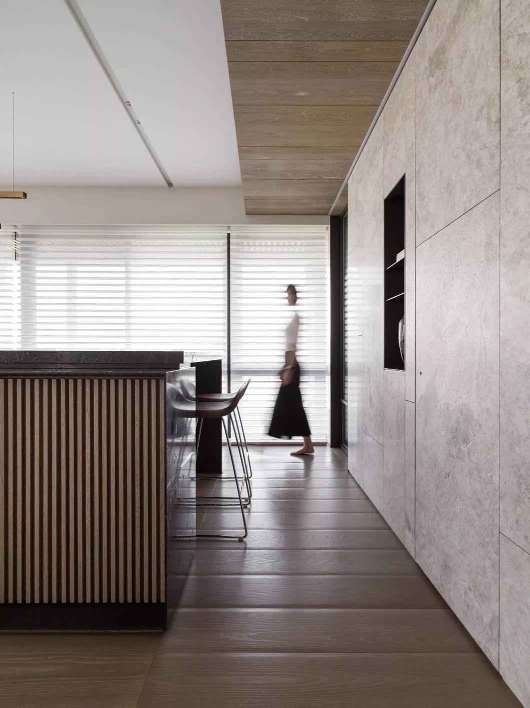 经过玄关进入整体开放式的区域,包含西厨中岛、餐厅、客厅兼书房等功能区域,开放式的家庭中岛作为住宅的核心主轴,利用中岛的量体创造空间中的主要格调。