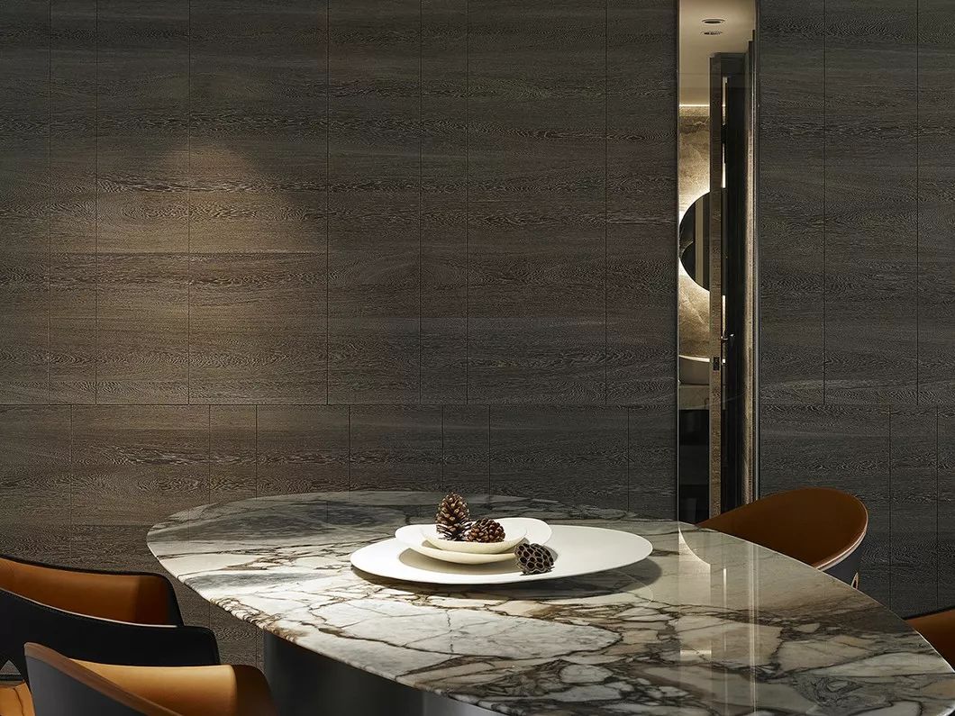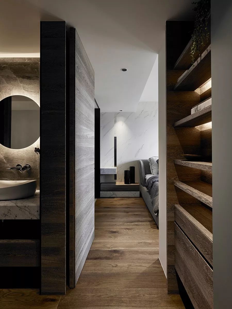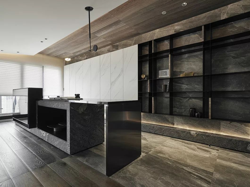 空间由点、线、面、量体之间纵横镶崁,比例分割的收放,元素之间的堆砌,以石材为基础,木质为辅,木石之间错纵堆叠,引入沉着稳重的空间感触,肌理的真实感受,厚实的质感沉淀室内氛围。