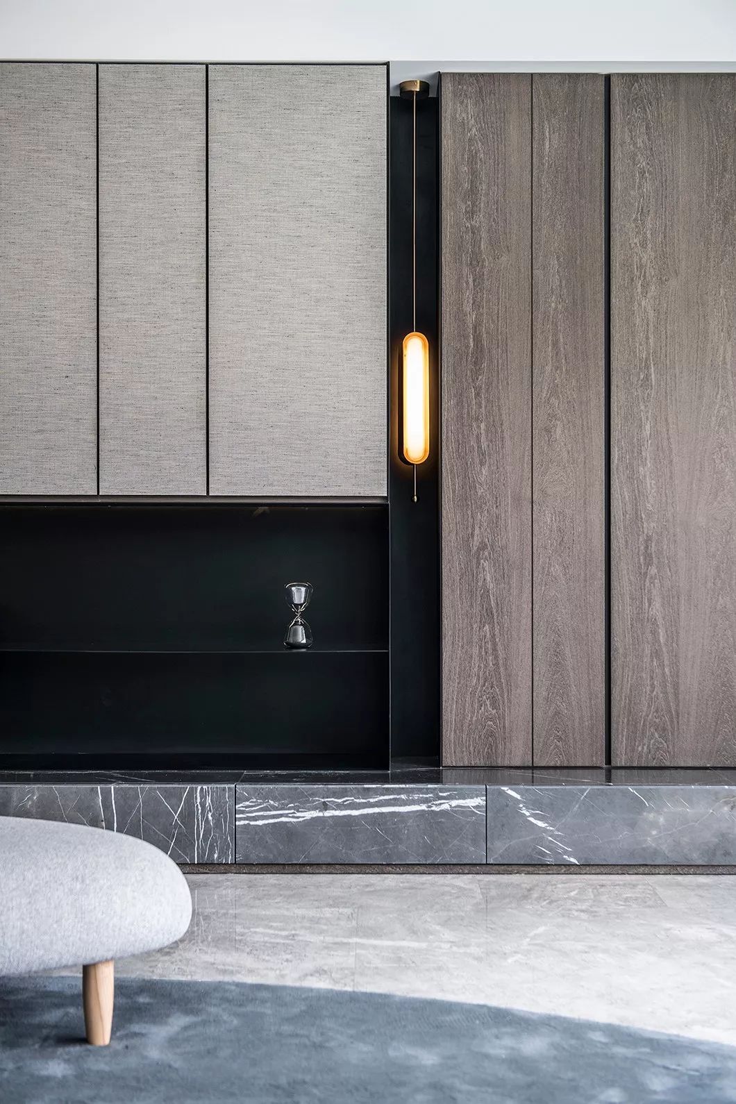 色块的堆栈、镜面的延伸,赋予原有建筑室内构造的趣味性,设计师以简洁的墙体形构出生活的场域。整体空间之中,设计师尝试解放造型符号,让纯粹的墙体关系、灯光变化形成设计中的系统。