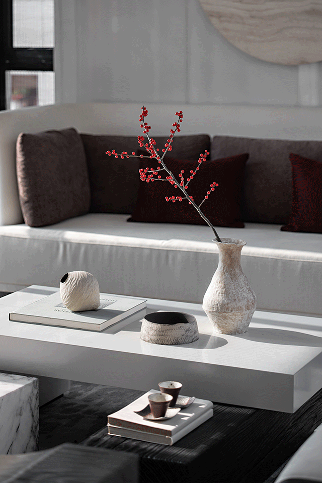 空灵与充实是艺术精神的两元,空间适度的留白营造着平淡素雅的美感,而光影的饱满感、情感的充盈,使得室内的虚与实相生。室内一片光明莹洁,像在画境之中,宋代有诗言——“隔帘花叶有辉光”,想必便是这样的景致了。