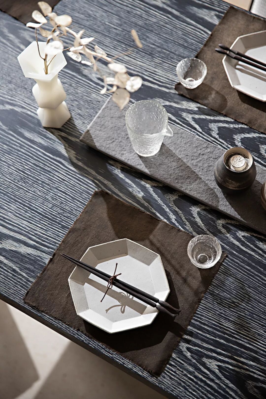 餐区的设计亦以简雅为意,贴近自然的木色与纹理、手作的扎染布艺、古雅的八角盘与清冽的琉璃杯樽等器物陈设,在弥漫着一室淡淡花香的空间内,娓娓地述说着东方的故事。