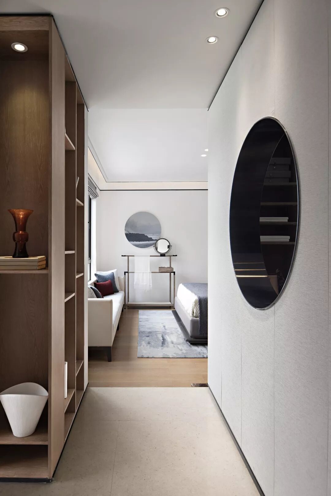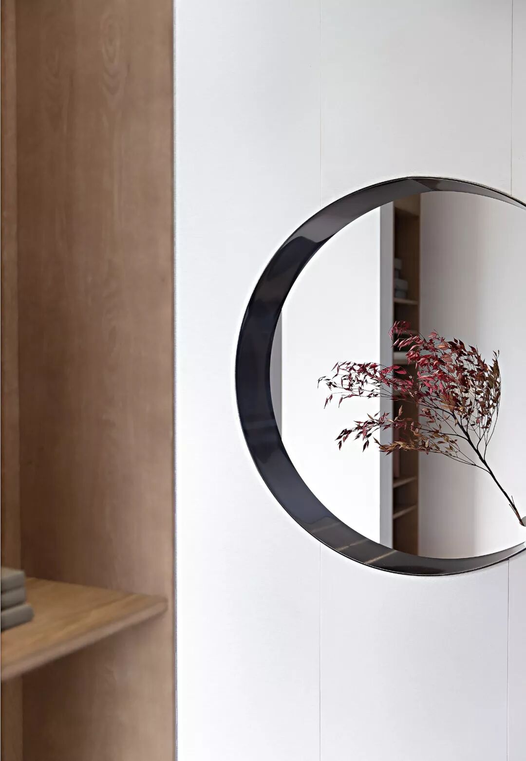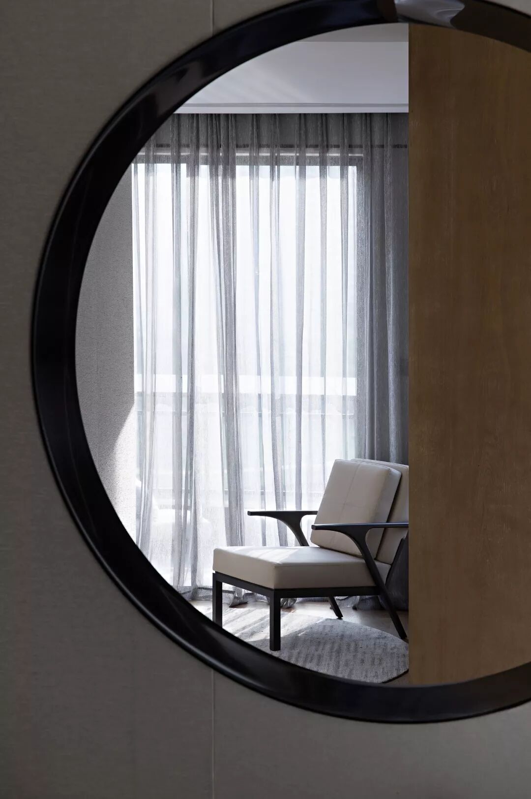 一扇月洞窗引导着室内的清气肆意流通,是空间的区隔也是链接,将内外的光景各自框成一幅画面,静谧而美好。纱帘作屏,将暖白的光辉分离得细碎柔软,有韵律感地跳动着、抚摸着椅背、床褥、白墙……浸漫出一室温煦的暖意。