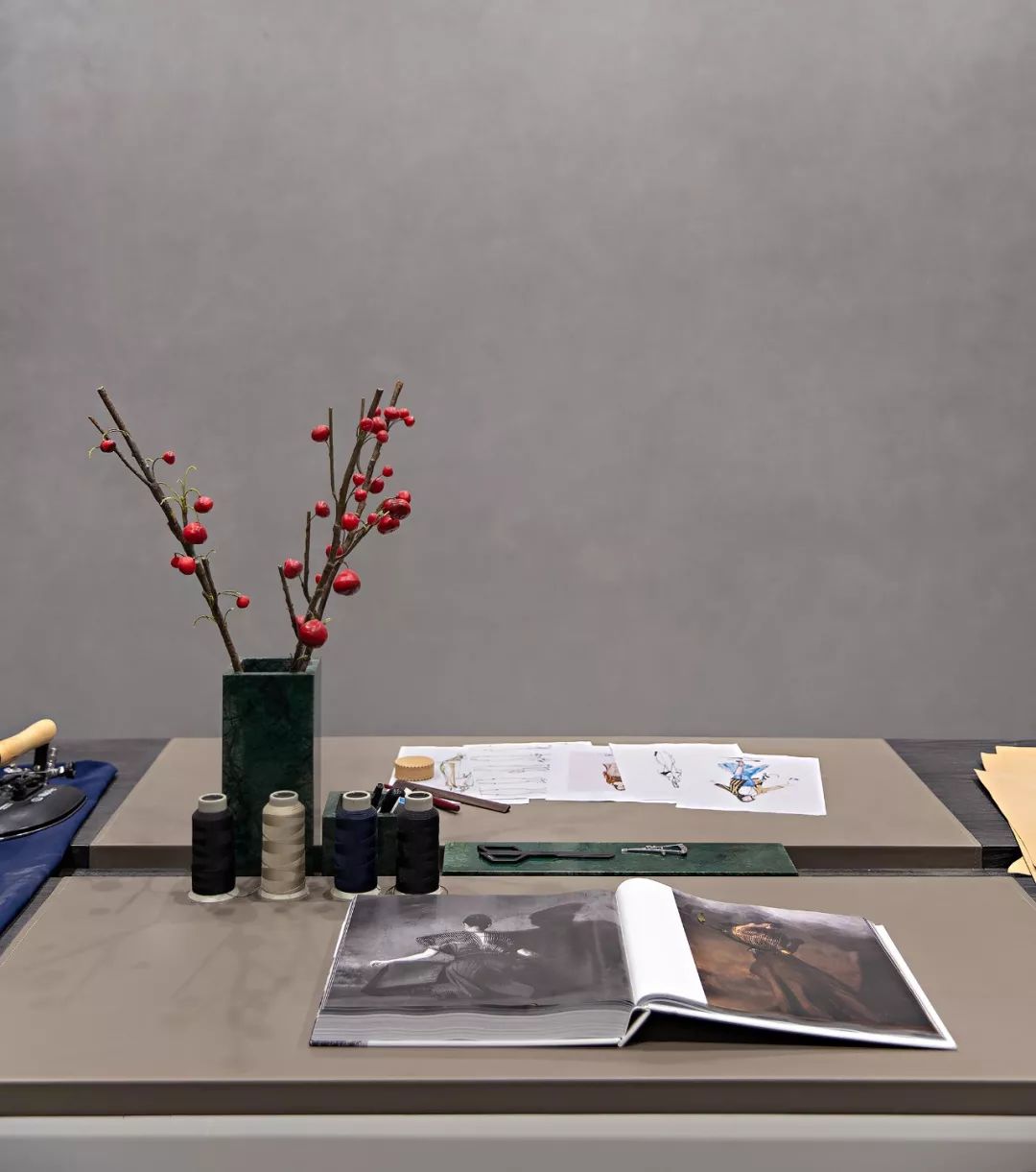 特意为女主人设计的一间工作室,糅合了现代的极简形制与东方的清冽秀气。一方长桌与开放性的挂衣架构设其中,唯一的点缀是几枝冬青,空间显得十分静宁。