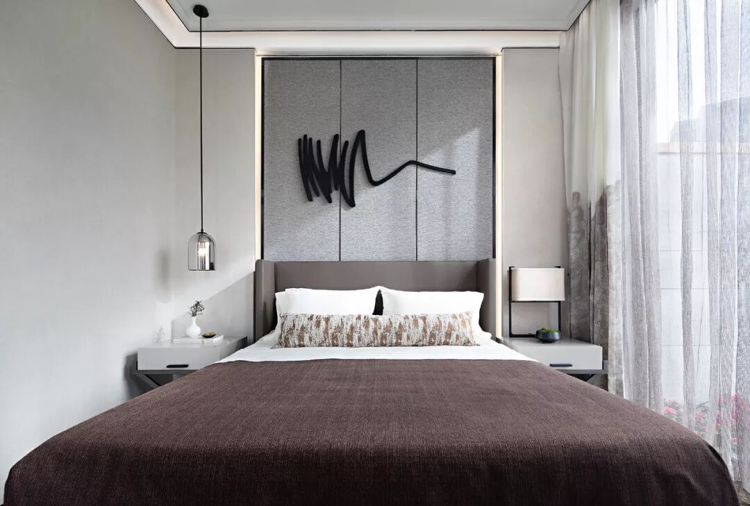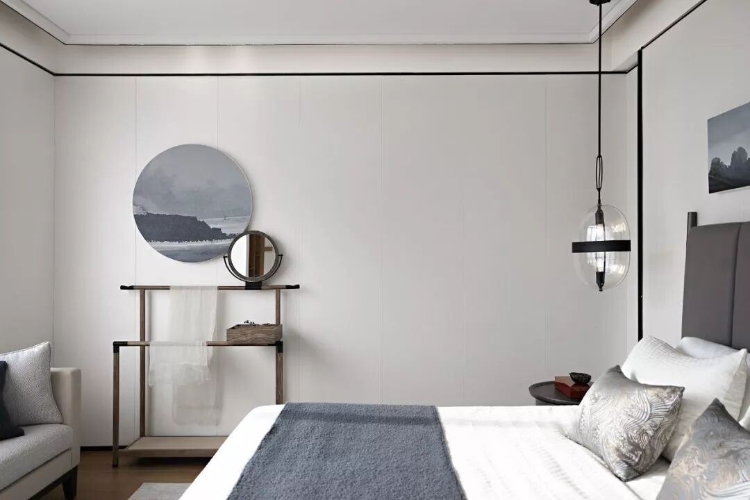 主卧空间是简洁质朴的设计,着墨不多,却在不露声色中流淌出涓涓禅意。棉麻、羊毛与木制搭配出细腻质感,带着浓浓古朴韵味的插花茶具小品修饰着空间,山水的意象在挂画与床品上散着诗意,清透的玻璃透着微烁的光,这个休憩空间流露着一片素净淡雅的美。