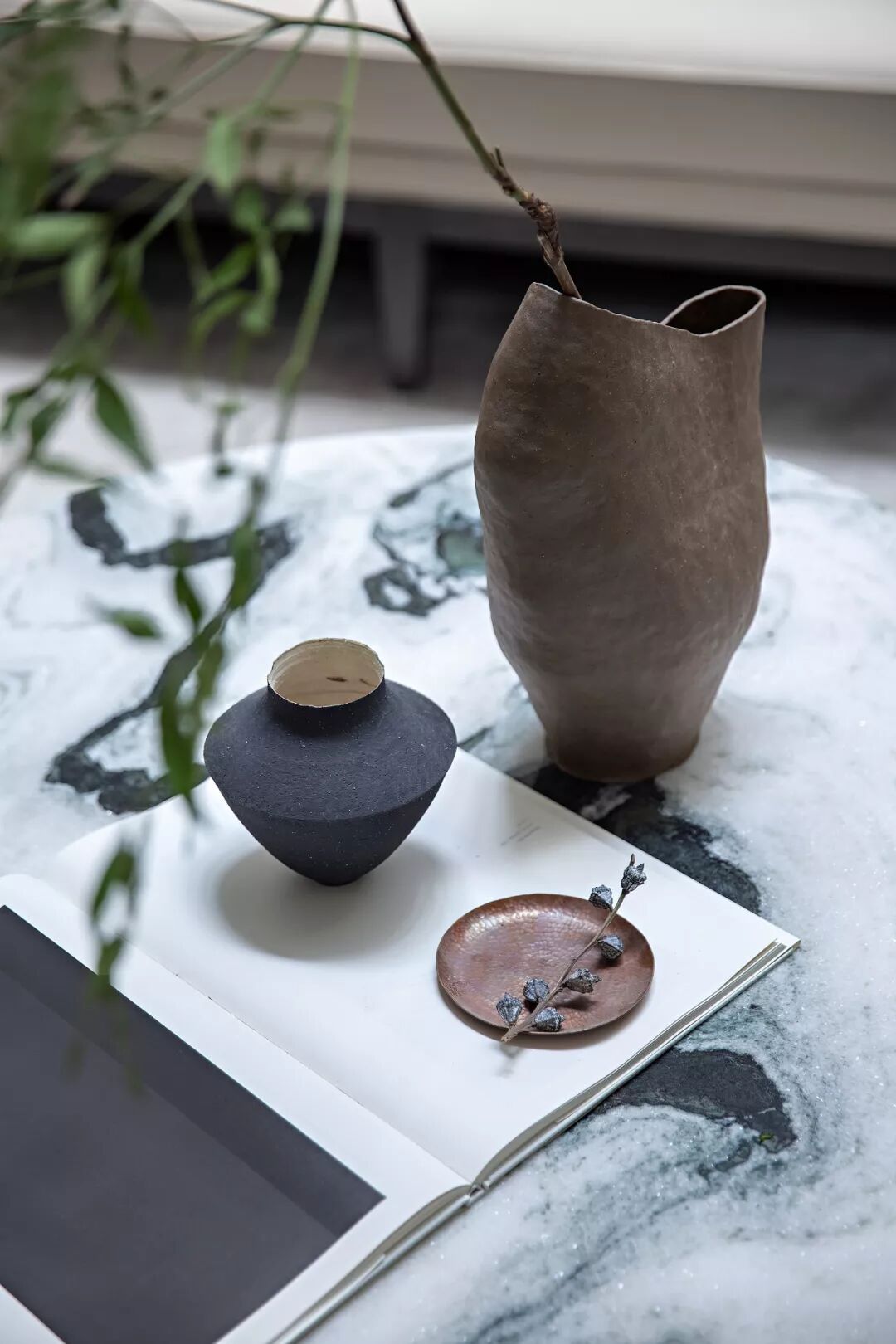 兼容宋代美学与现代主义的极简法则,鉴宝台的设计以墨色与灰调、木色与素白描绘空间。内嵌入墙的木制书架上随意地陈列着陶瓷器具与旧书,与素净的雪柳、清透的碧石,共同勾勒出清雅恬淡的文人精神世界,丰盈而绵长。