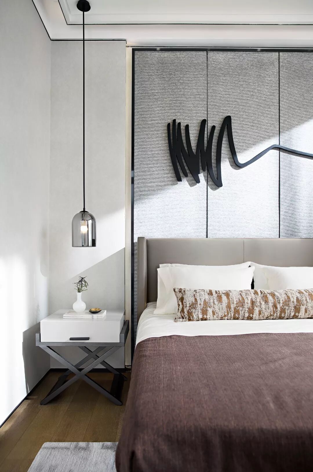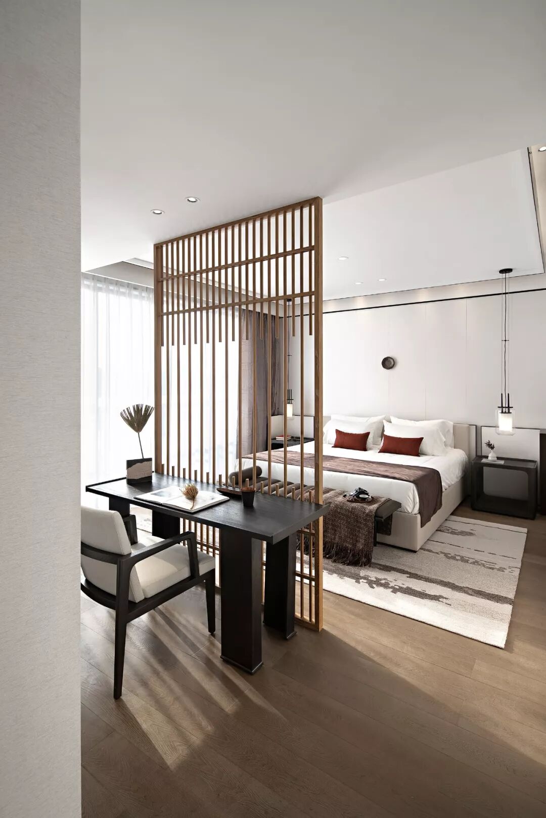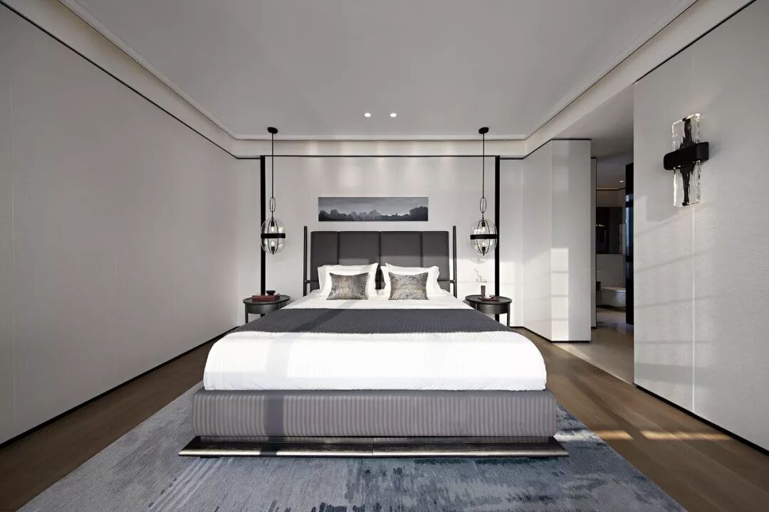 客房设计是婉约派诗词的风格,朱红与素白相互映衬,山水的元素贯穿在室内软饰上,空间的气韵清丽柔雅。背景墙的装置是设计对东方语素的延展,笔墨的性格被极致地描绘出来,洒脱且随性。