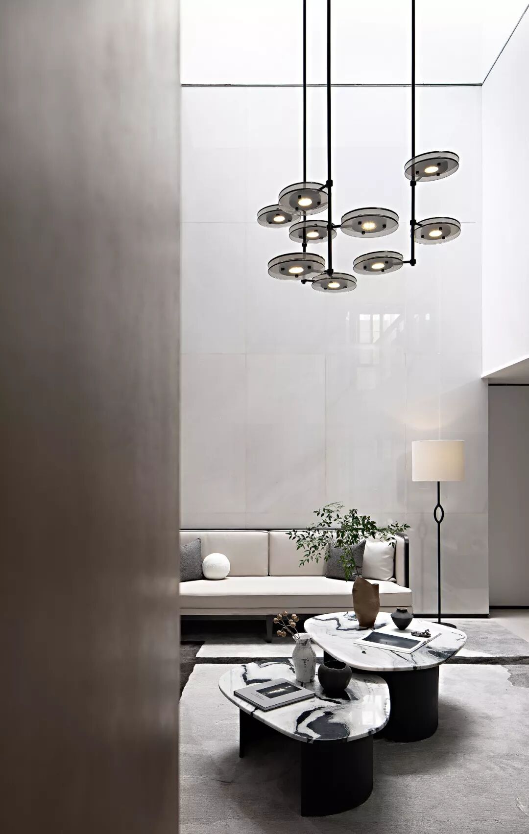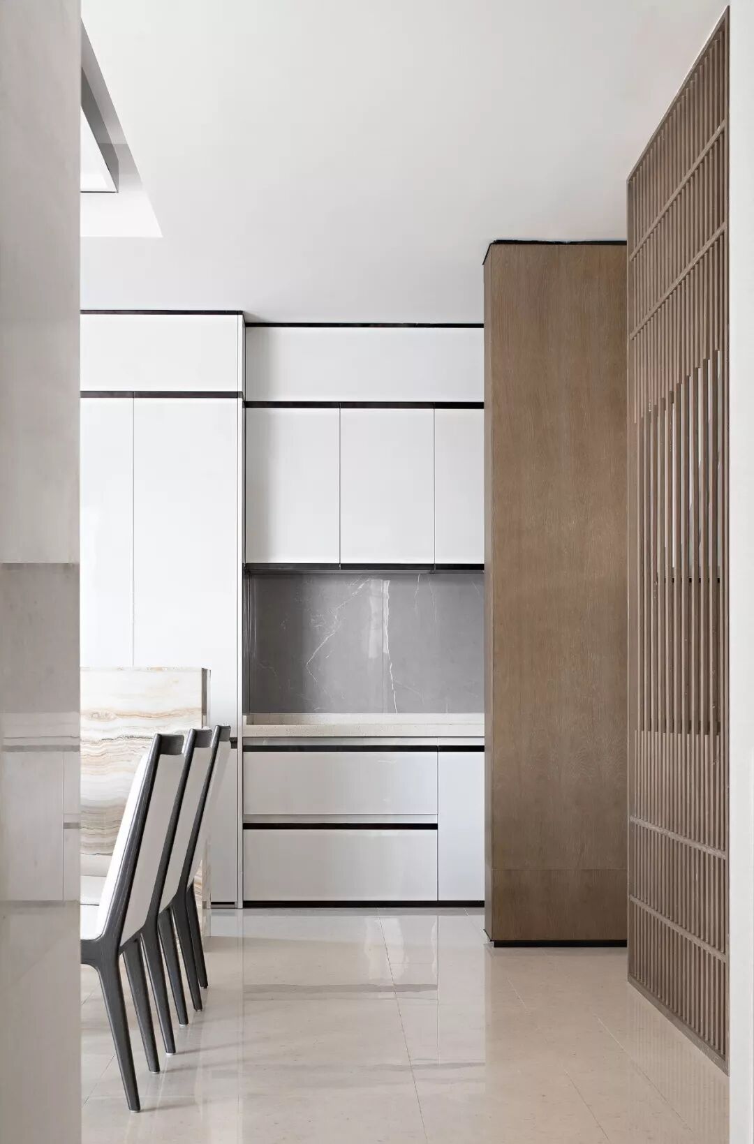 中部挑空的层高为负二层的会客厅带来无垠的视觉观感,一侧开辟的天窗纳入晴光与月色,空间明媚而清丽。