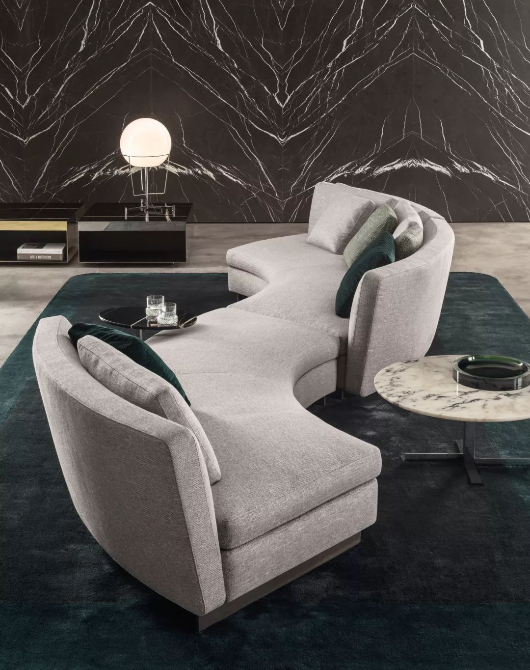 弧形沙发一般以围合的方式摆放,很容易营造出热闹、欢乐的氛围。尤其是塑造不对称空间或角落空间时,它能瞬间展现出时尚感。优雅的弧线造型打破了沙发一定要靠墙的传统,让客厅更有人情味。