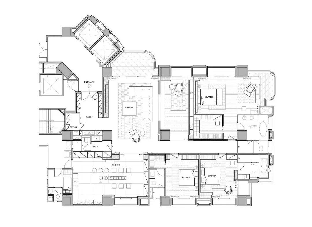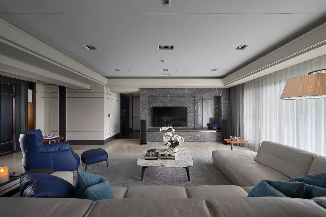 ▲大胆改变电视墙的原始位置,反利用压梁将电视框成一面风景,令沙发区独立且扩大延伸。