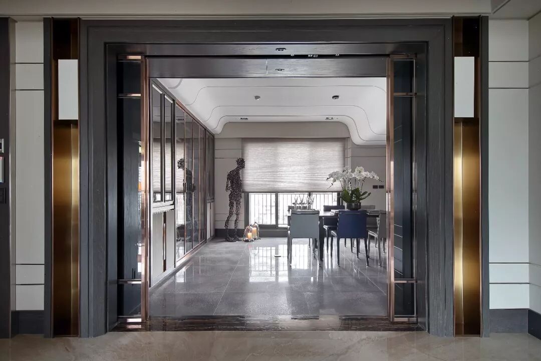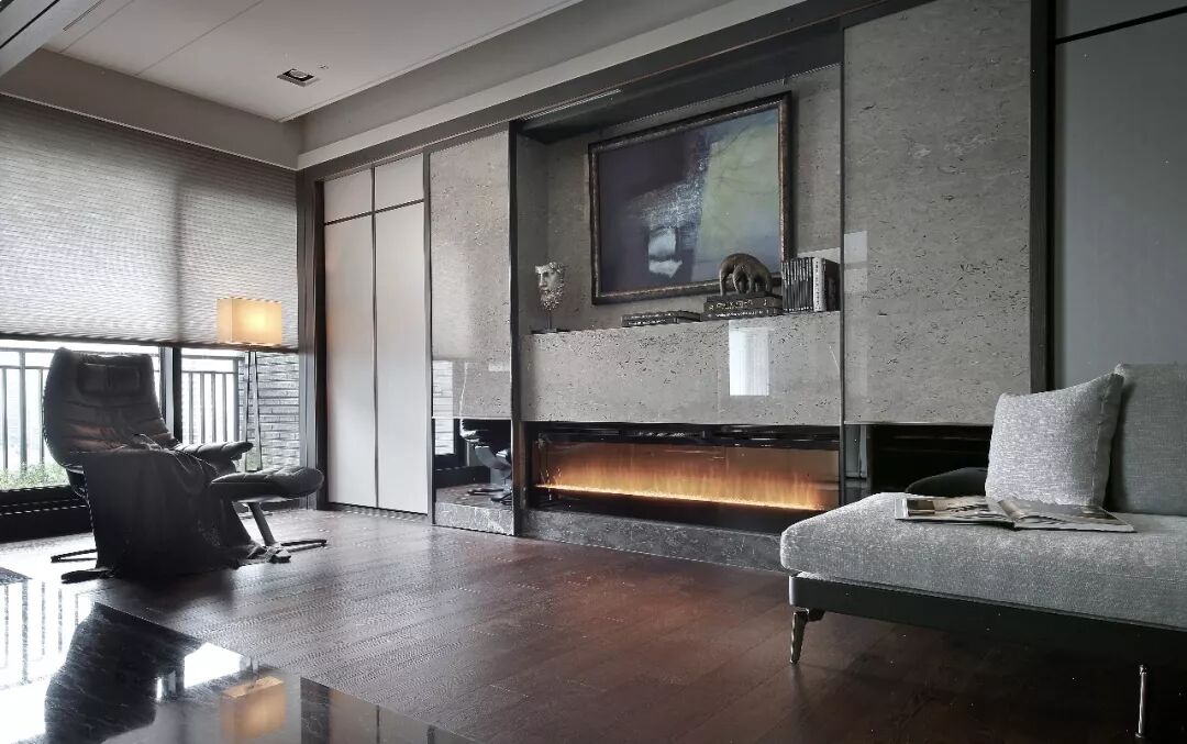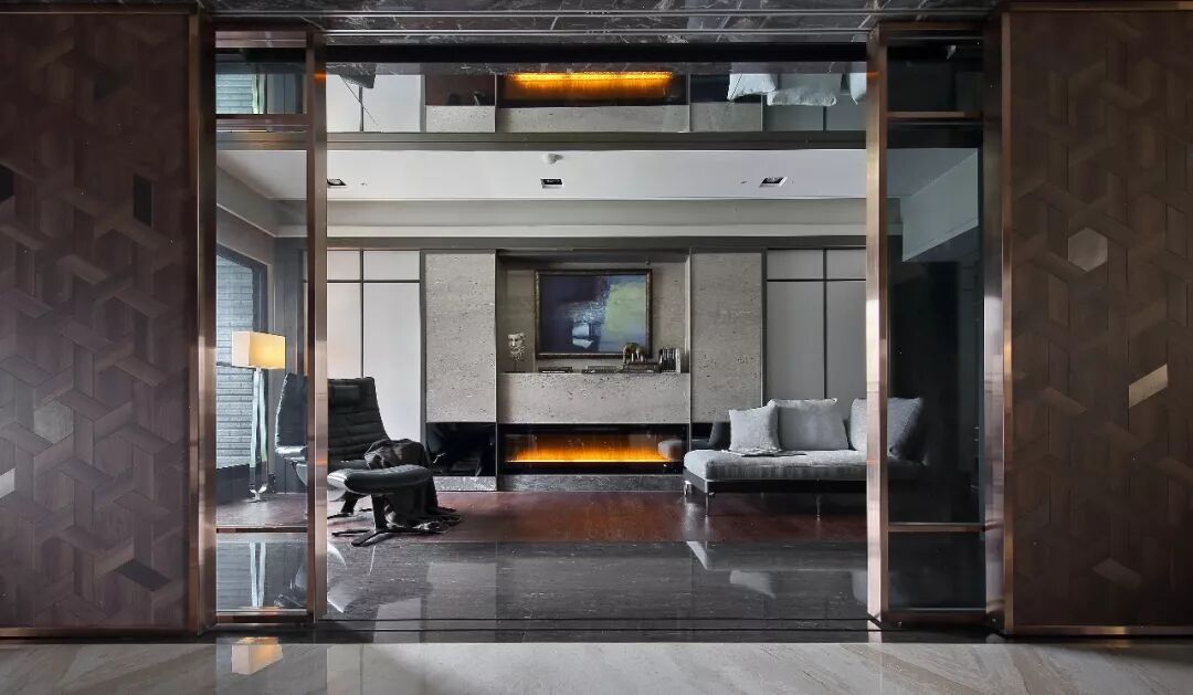 ▲工艺拉门内的半透明黑色玻璃可让视觉无限延伸,开门即见温暖壁炉迎接主人。