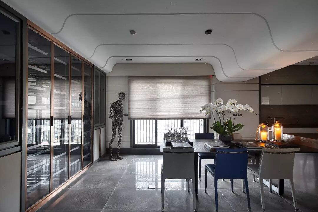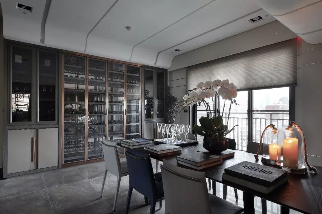 来到厨房,这里是家的心脏,在农历年回家的游子们,在餐厅谈笑海外趣事,一整面落地玻璃酒柜,以金属香槟色感的镀钛边框营造轻奢氛围,喝不完的藏酒佐以说不完的话题,为了方便长者出入还设置了自动门,让整个餐期流畅进行。