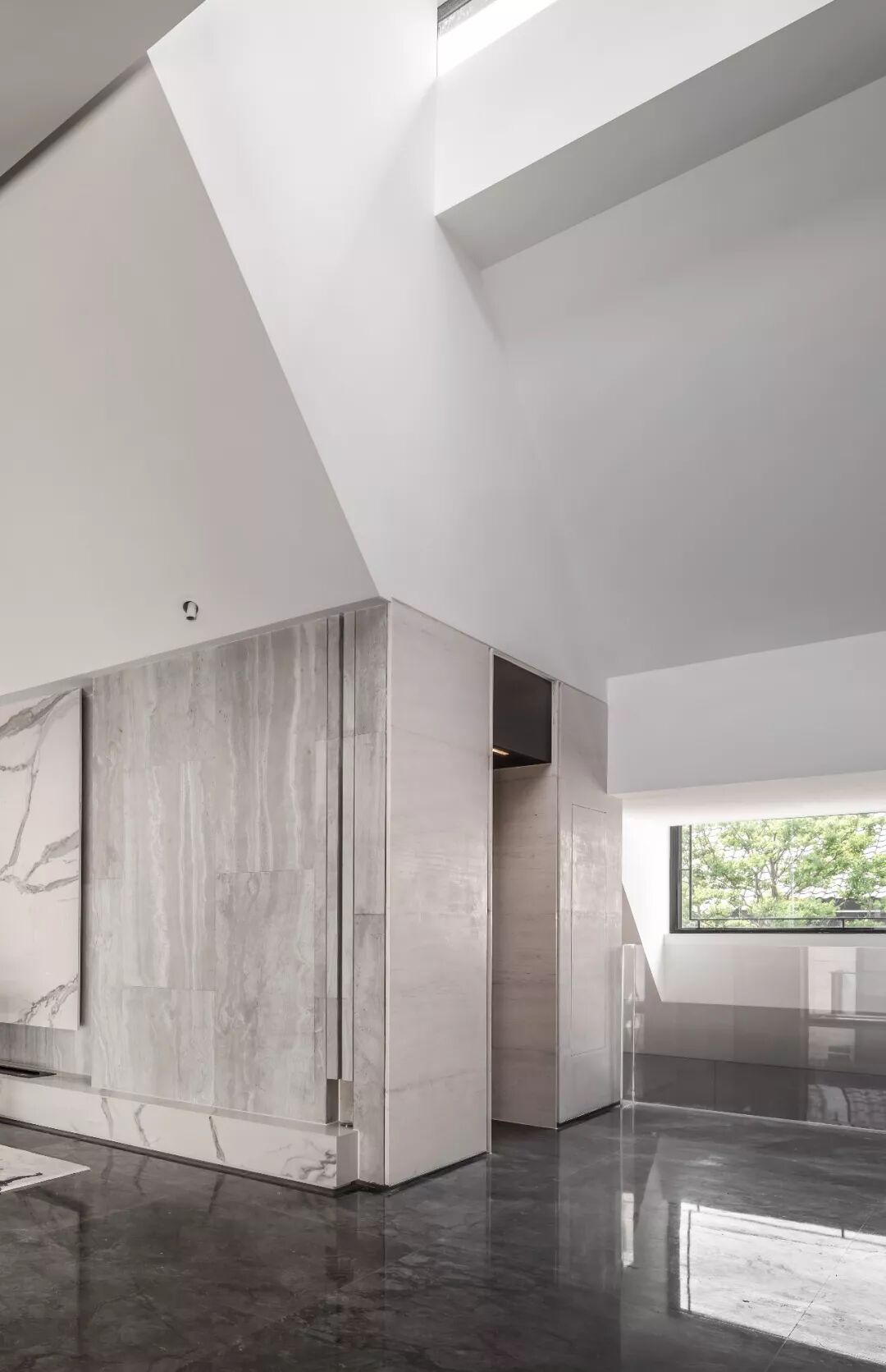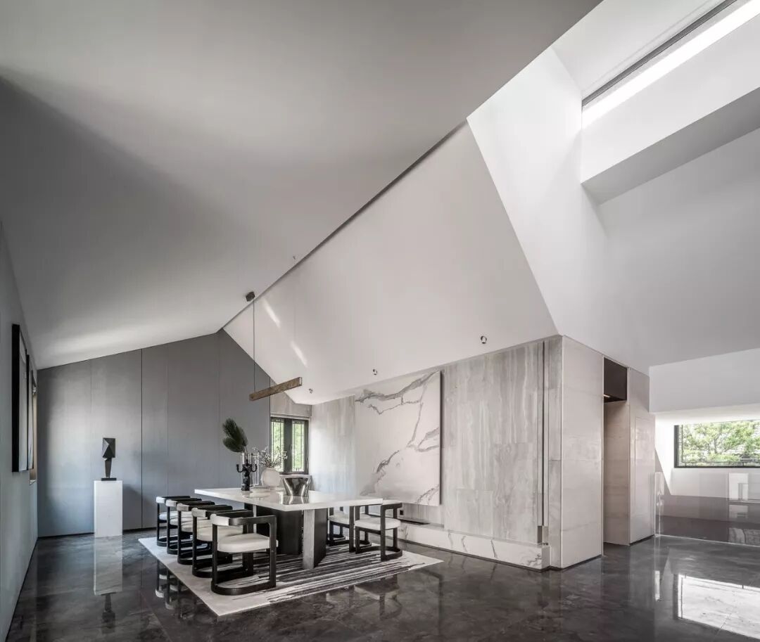 一路向上,顶层楼梯区运用几何美学元素在狭窄的空间中呈现出层次感,阳光顺着窗户慢慢渗入,将空间照亮。灰与白、虚与实、抽象与具象,空间营造静谧而深远的观感。