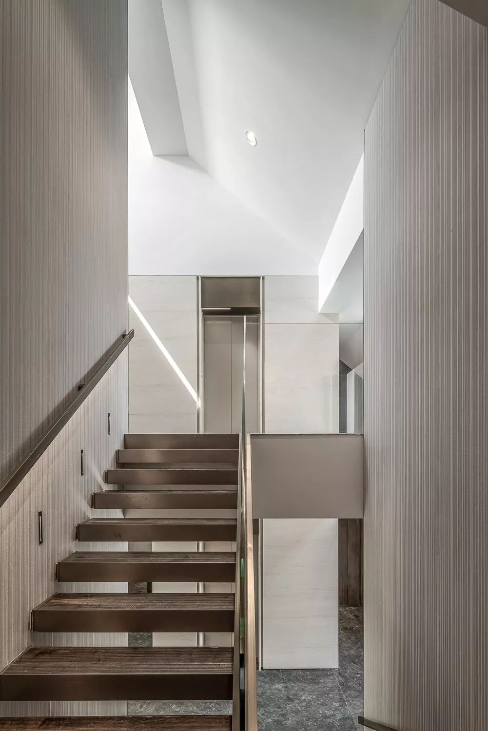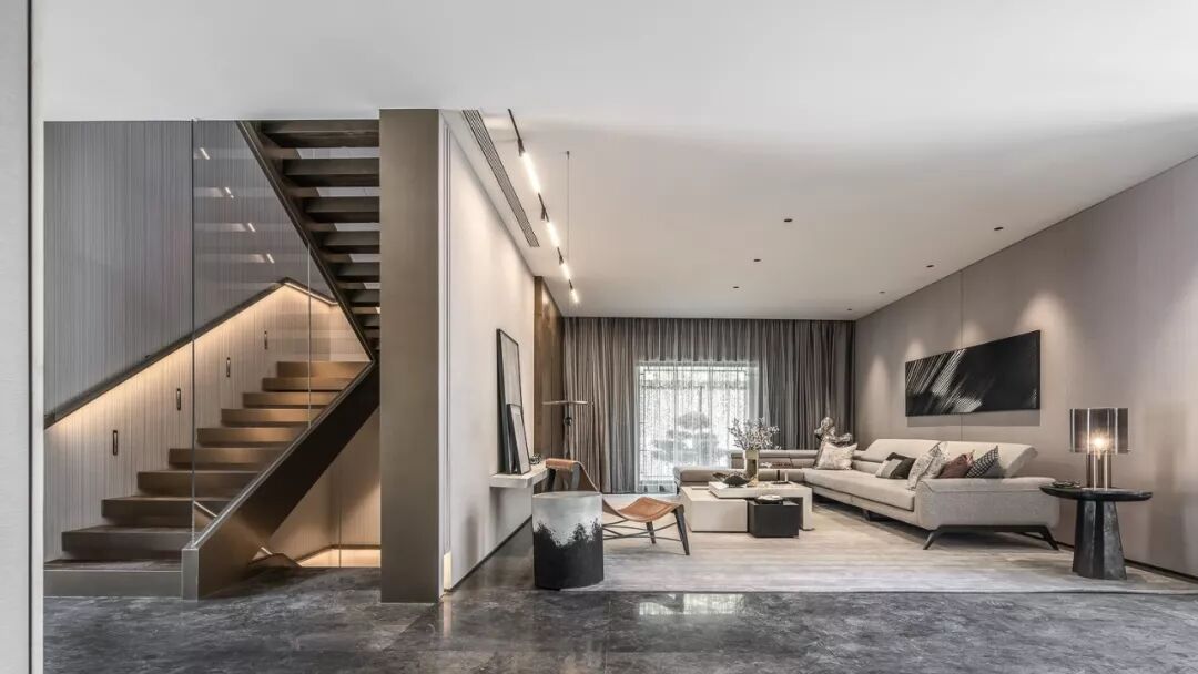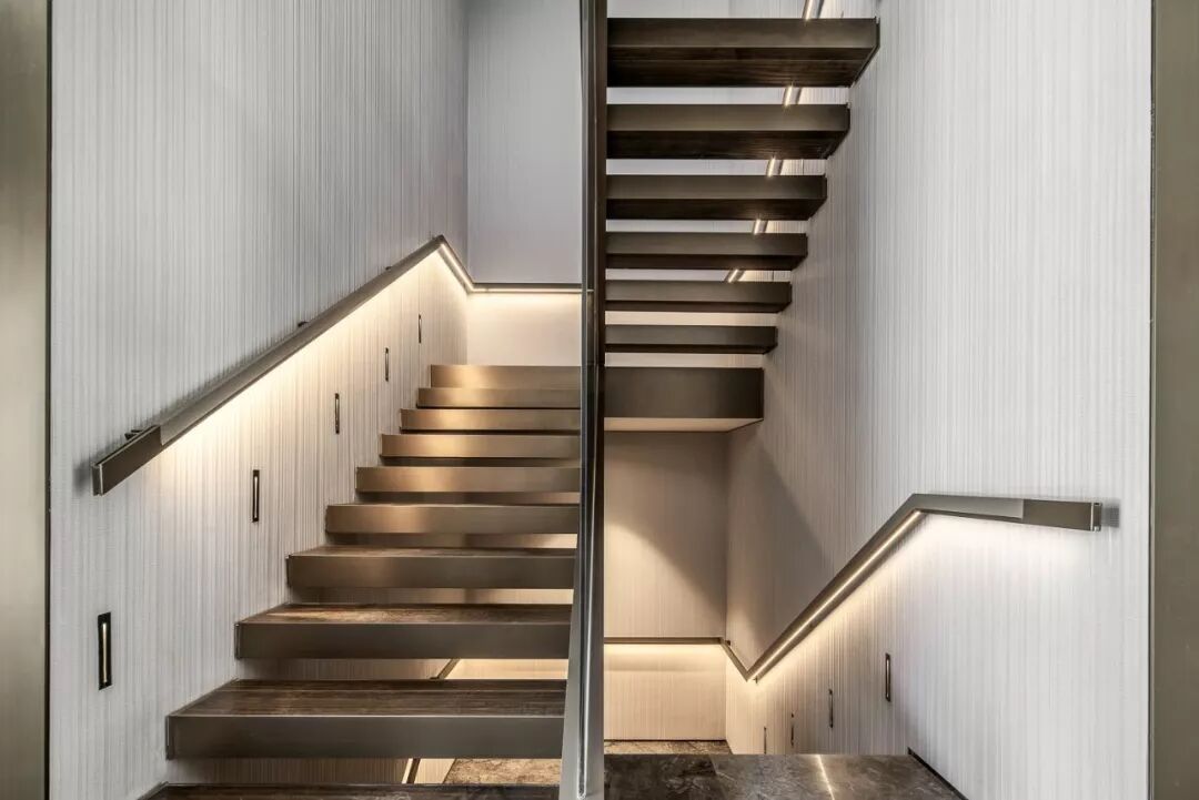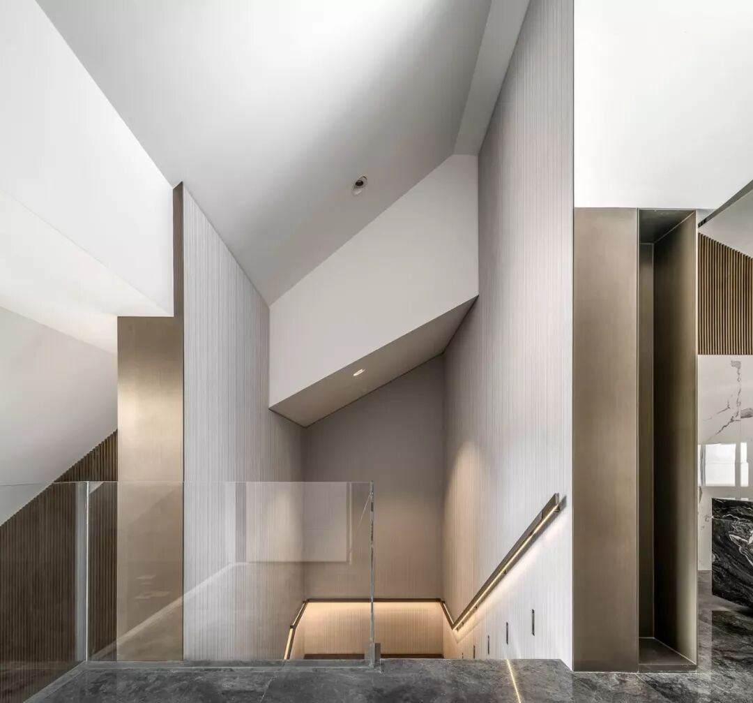 挑高的楼梯区将精致的生活格调层层铺开,利落的线条伴随暖色光线充盈其中,表达精致的空间诉求。金属材质的冰冷在人与人的连接中,带来一丝暖意与高雅之感,串联起室内的情感主线。