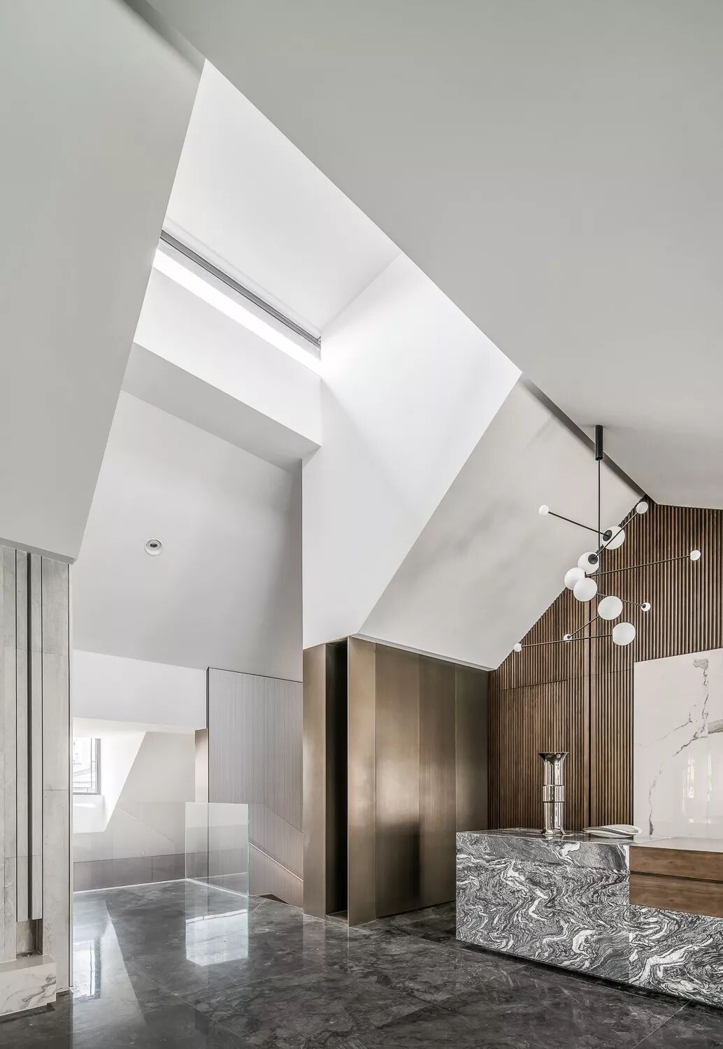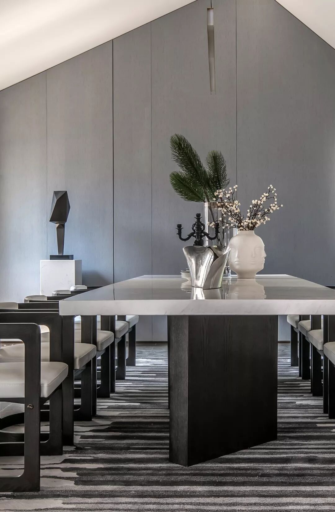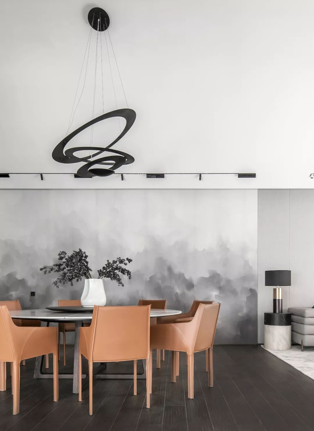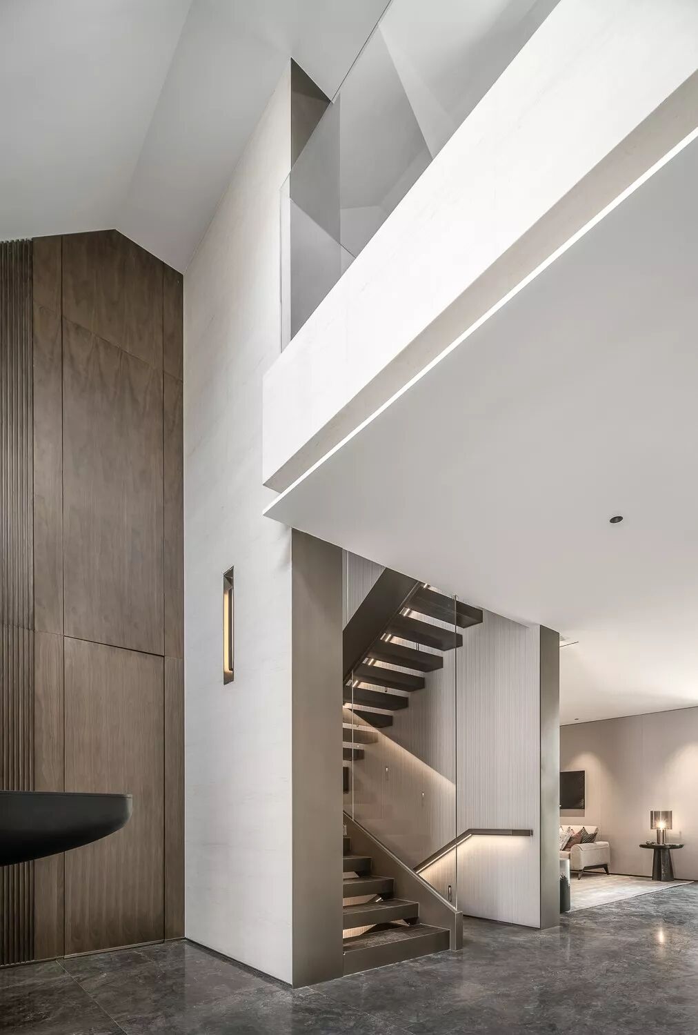 挑高的楼梯区将精致的生活格调层层铺开,利落的线条伴随暖色光线充盈其中,表达精致的空间诉求。金属材质的冰冷在人与人的连接中,带来一丝暖意与高雅之感,串联起室内的情感主线。